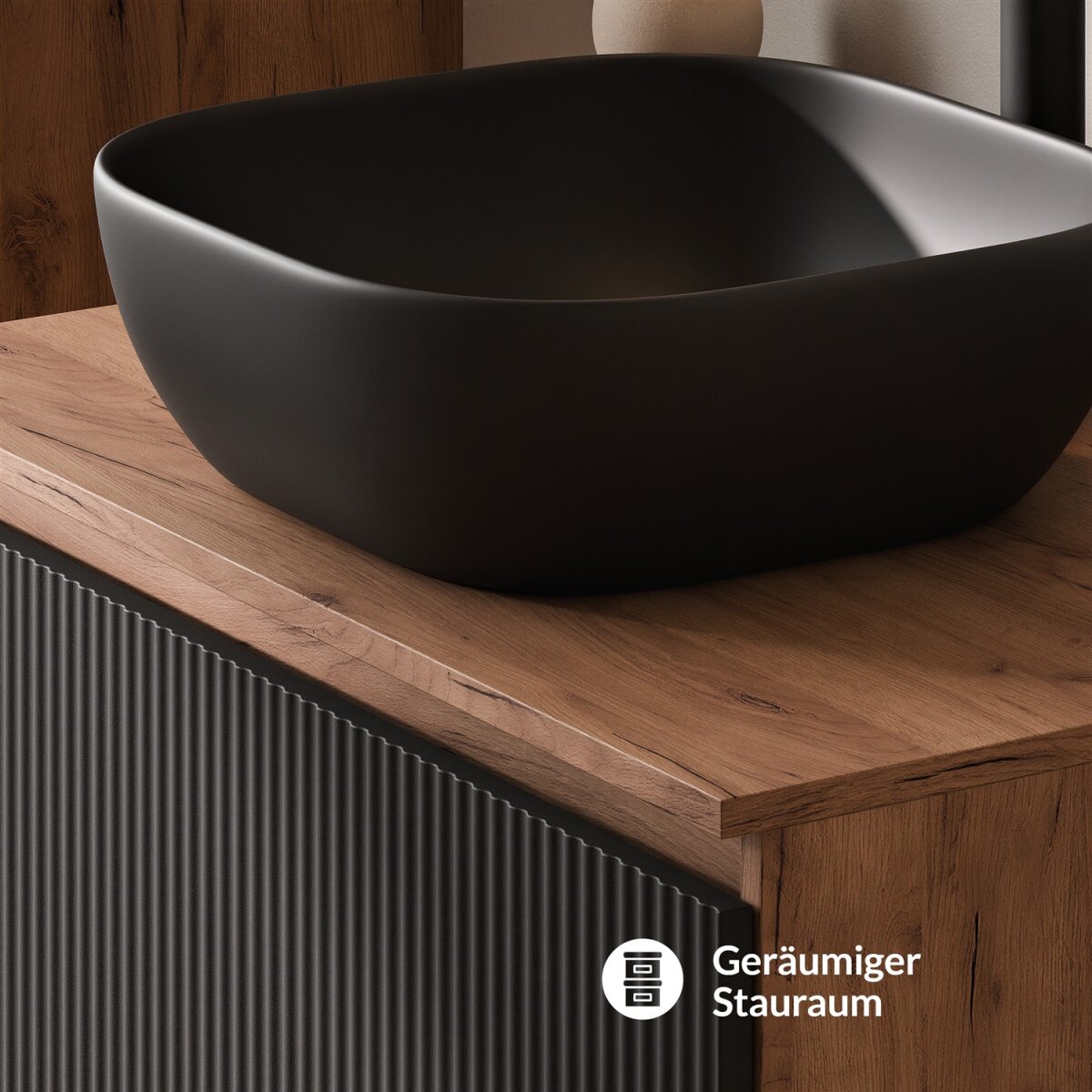 Das ARISA Badmöbel Set vereint modernes Design, hochwertige Materialien und praktische Funktionalität zu einem harmonischen Gesamtbild. Die elegante Front in matten geriffeltem Schwarz, verleiht Ihrem Badezimmer eine edle und zugleich wohnlich-moderne Ausstrahlung.