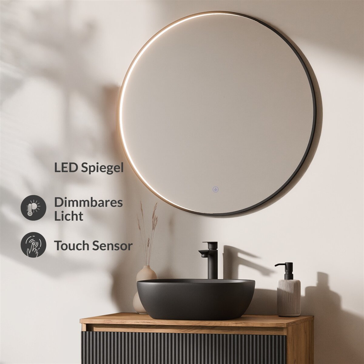 Der runde „Veluna“ LED Spiegel vereint moderne Ästhetik mit praktischer Alltagstauglichkeit. Die integrierte dimm- und farbverstellbare LED-Beleuchtung (Warmweiß, Neutralweiß oder Kaltweiß, 4200 K) sorgt für ein angenehmes, natürliches Licht.