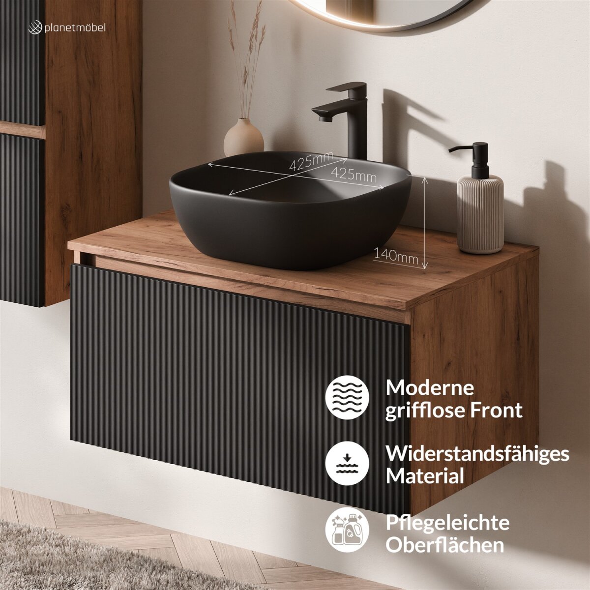 Das Keramik-Aufsatzwaschbecken (42,5 x 14 x 42,5 cm) überzeugt mit glatter, kratzfester Oberfläche und die edle, tiefschwarze Farbgebung fügt sich perfekt in das Design des Waschtischs ein.