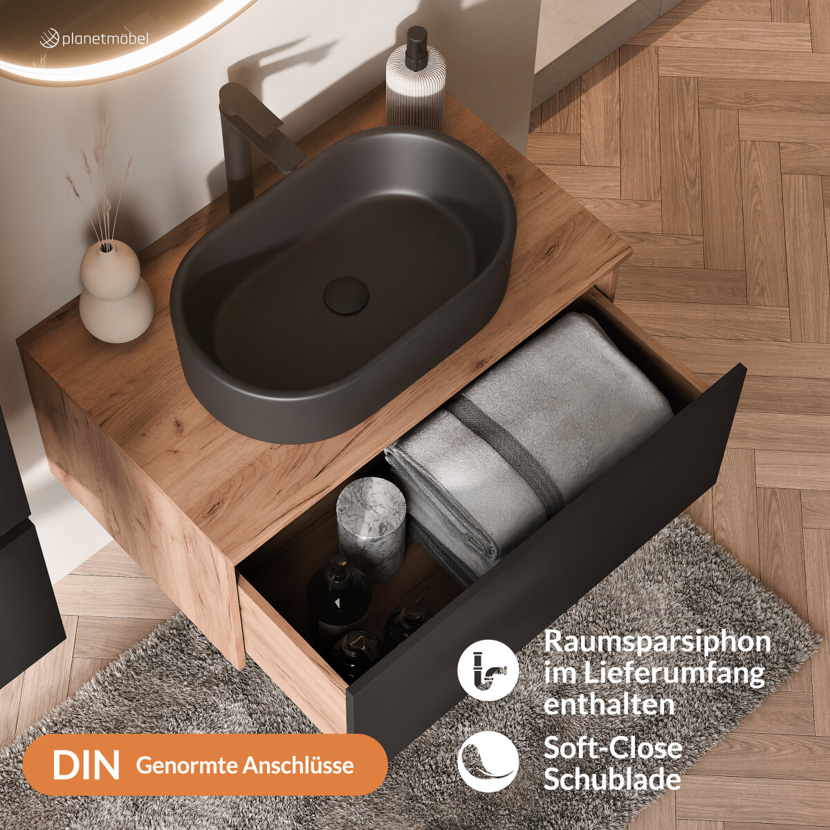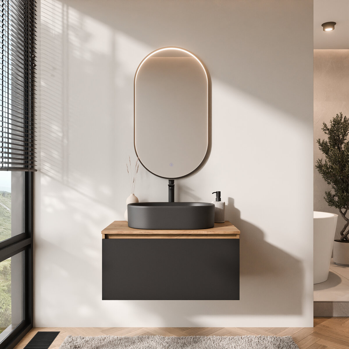 ARISA Badmöbel Set mit Aufsatzwaschbecken & „Glora“ LED Spiegel – Modernes Design mit Soft-Close-Funktion