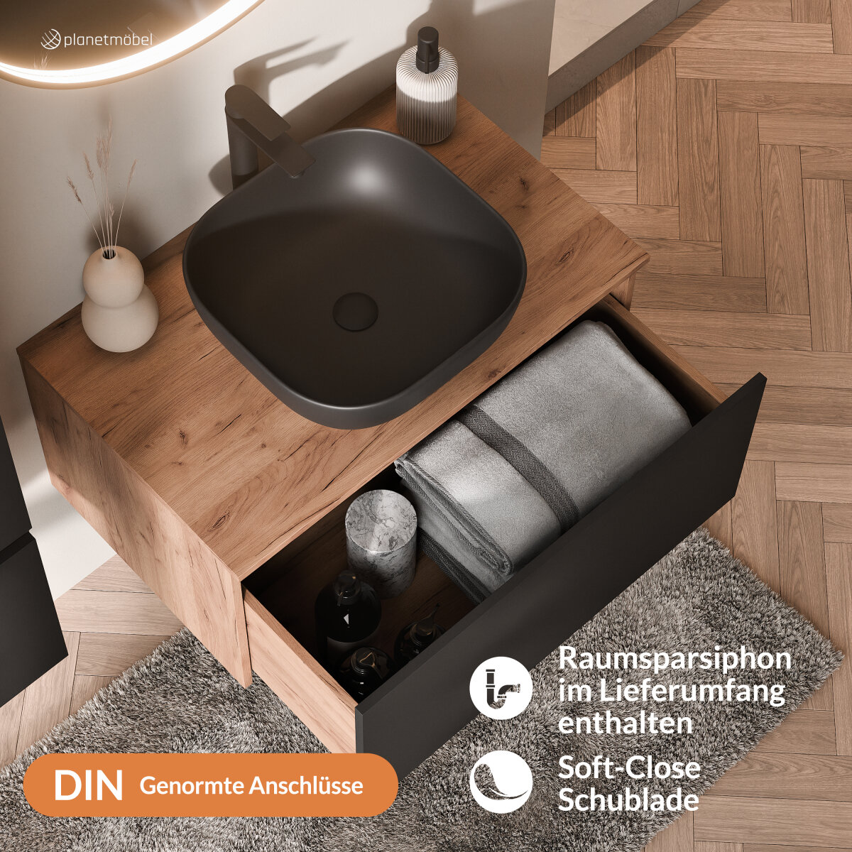 ARISA Badmöbel Set mit Aufsatzwaschbecken & „Glora“ LED Spiegel – Modernes Design mit Soft-Close-Funktion
