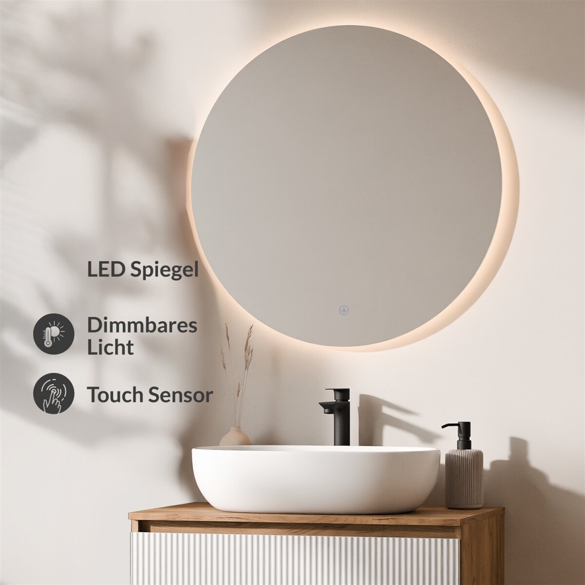 Der runde „Nova“ LED Spiegel vereint moderne Ästhetik mit praktischer Alltagstauglichkeit. Die integrierte dimm- und farbverstellbare LED-Beleuchtung (Warmweiß, Neutralweiß oder Kaltweiß, 4200 K) sorgt für ein angenehmes, natürliches Licht.