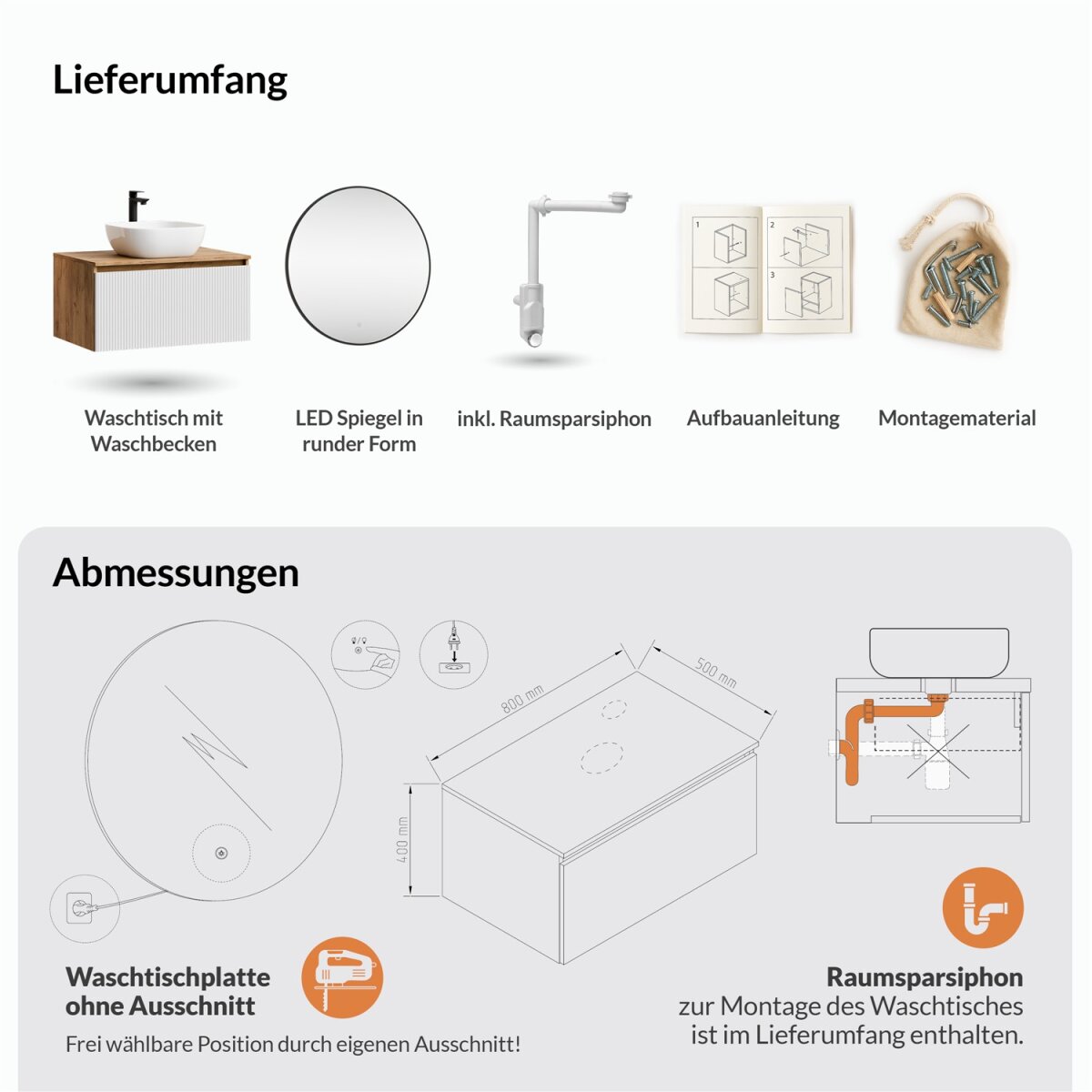| Maße Waschtisch ohne Waschbecken (B x H x T): | 80 x 40 x 50 cm |