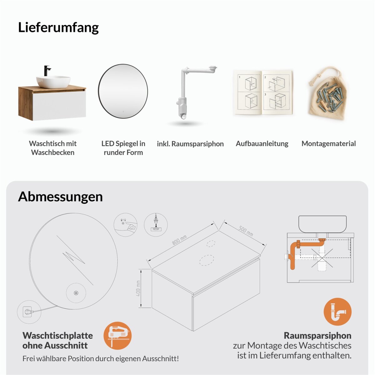 | Maße Waschtisch ohne Waschbecken (B x H x T): | 80 x 40 x 50 cm |