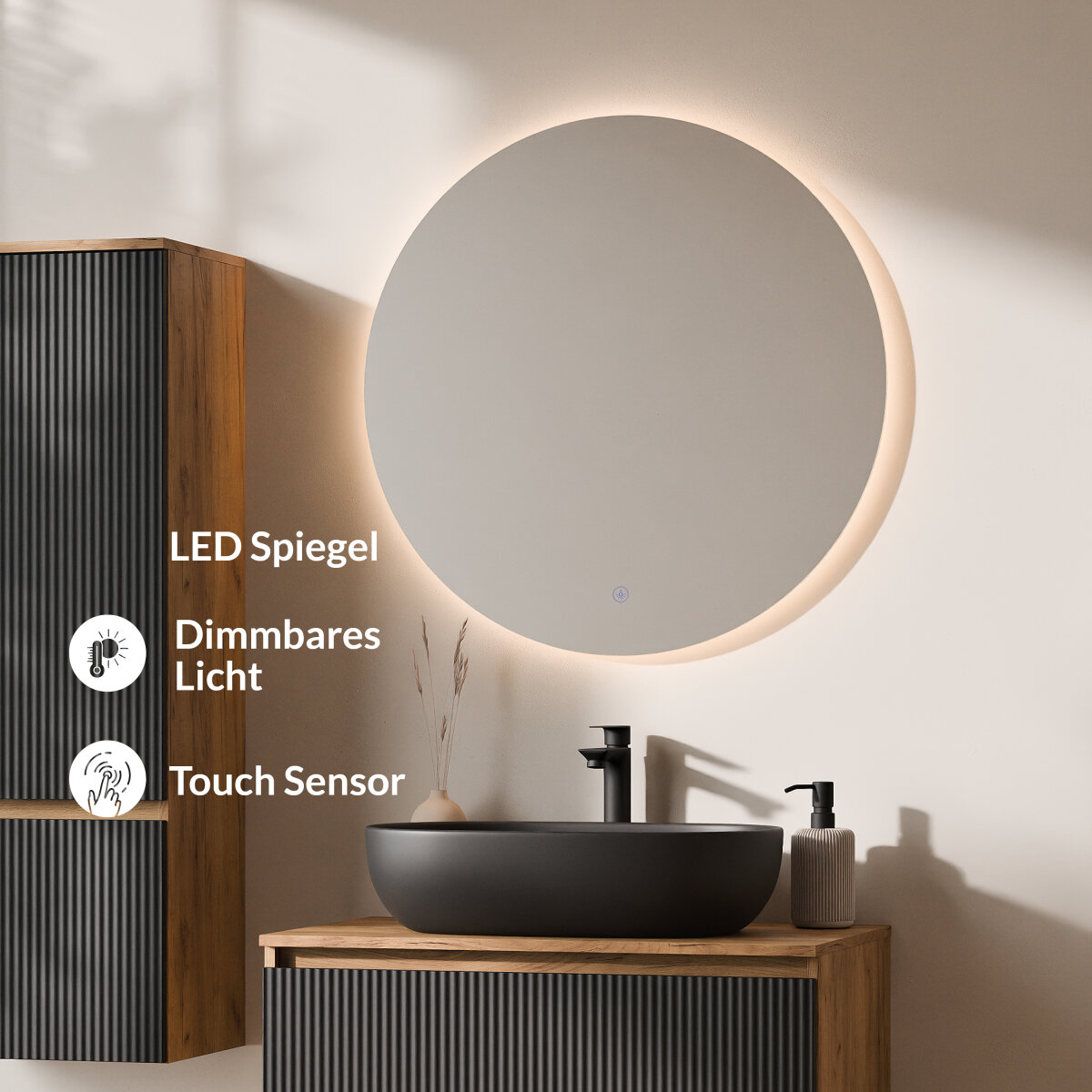 Der runde „Nova“ LED Spiegel kombiniert modernes Design mit hoher Alltagstauglichkeit. Die dimm- und farbverstellbare LED-Beleuchtung (Warmweiß, Neutralweiß oder Kaltweiß, 4200 K) sorgt für eine gleichmäßige, natürliche Ausleuchtung.