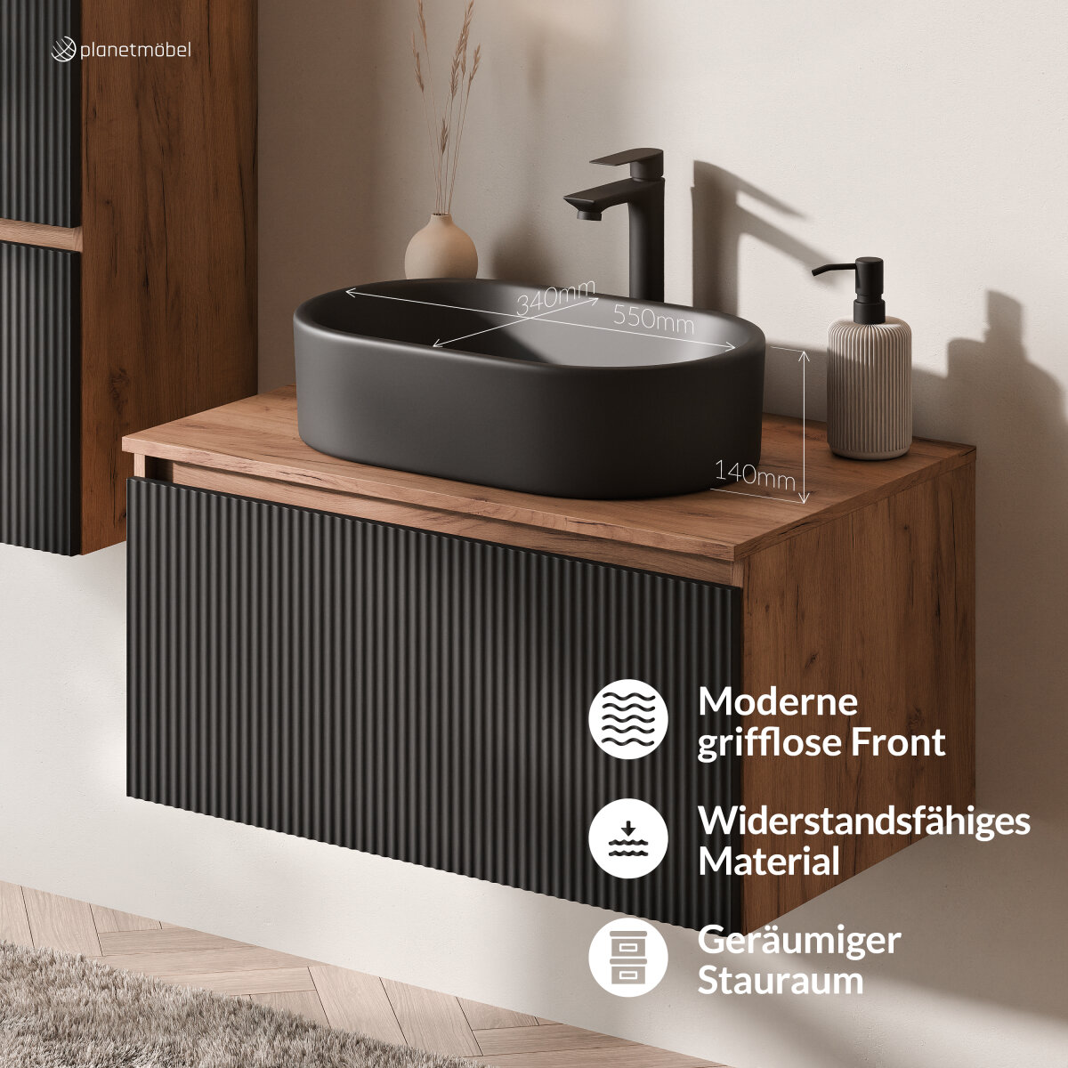 Das im Set enthaltene Keramik-Aufsatzwaschbecken (55 x 14 x 34 cm) besticht durch seine glatte, kratzfeste Oberfläche und die edle, tiefschwarze Farbgebung. So fügt es sich perfekt in das Design des Waschtischs ein.