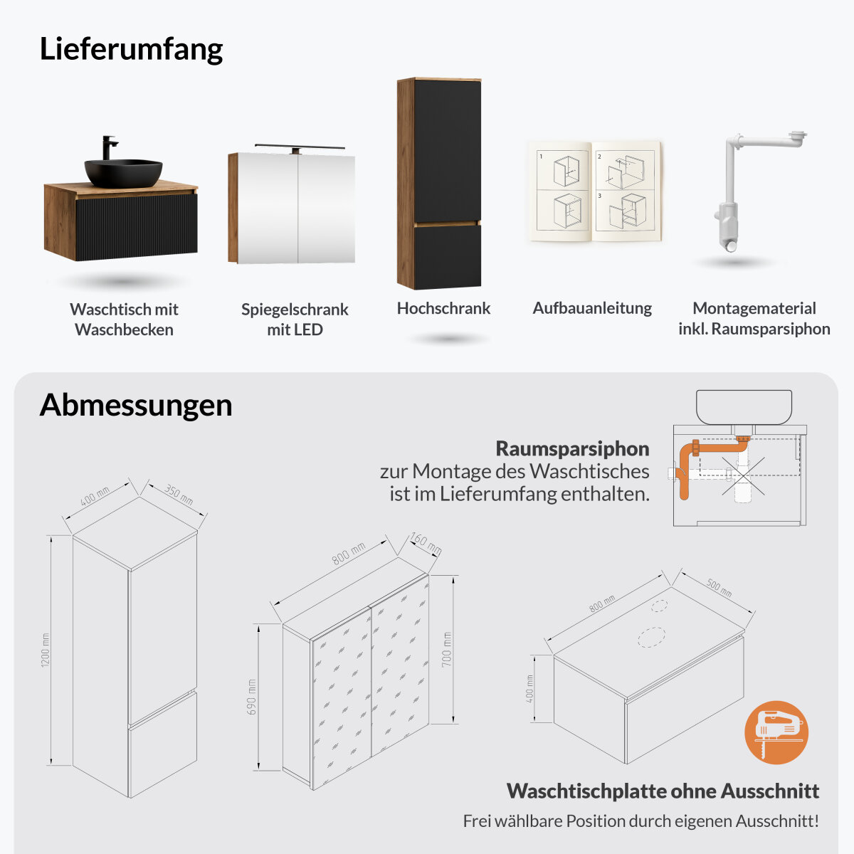 ARISA Badmöbel Set inkl. Hochschrank mit Aufsatzwaschbecken & Spiegelschrank ARIA – Modernes Design mit Soft-Close-Funktion