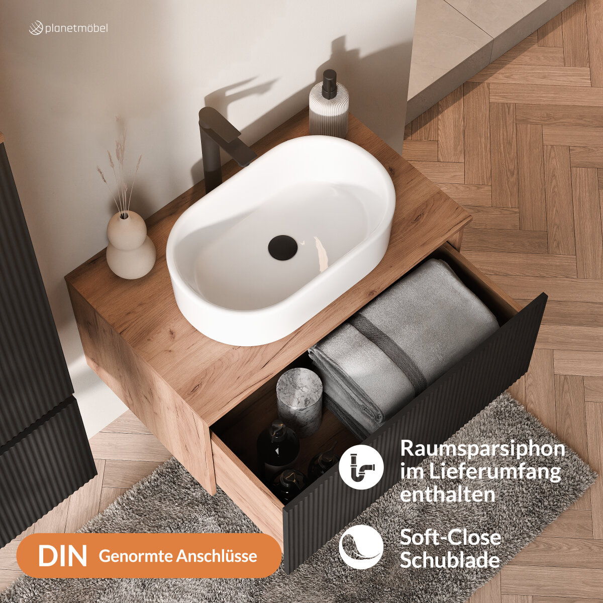 Das im Set enthaltene Keramik-Aufsatzwaschbecken überzeugt mit glatter, kratzfester Oberfläche und moderner Formgebung. Erhältlich in Schwarz oder Weiß sowie in drei Größenvarianten, fügt es sich perfekt in das Design des Waschtischs ein.