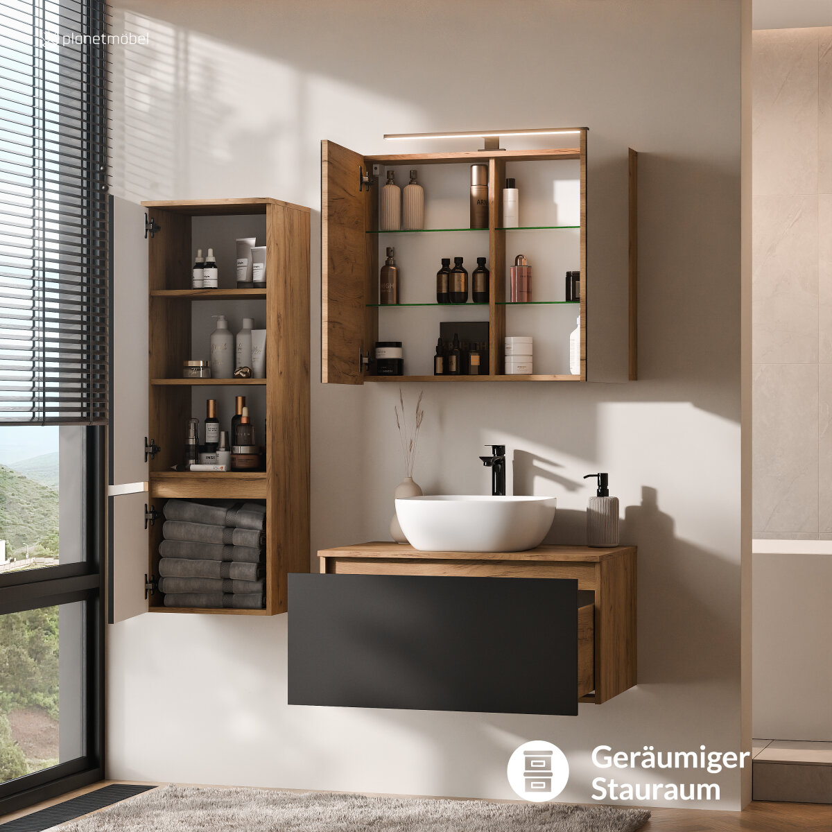 ARISA Badmöbel Set inkl. Hochschrank mit Aufsatzwaschbecken & Spiegelschrank ARIA – Modernes Design mit Soft-Close-Funktion