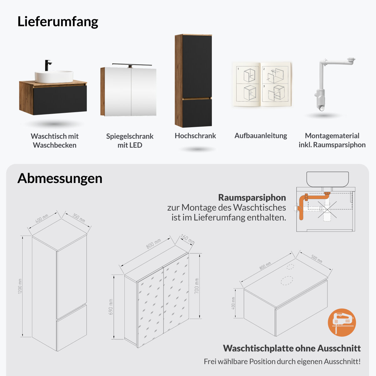 ARISA Badmöbel Set inkl. Hochschrank mit Aufsatzwaschbecken & Spiegelschrank ARIA – Modernes Design mit Soft-Close-Funktion