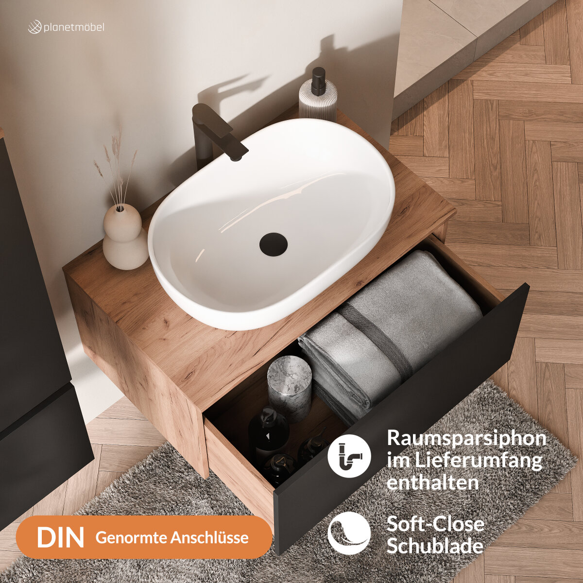 Der Waschtischunterschrank bietet großzügigen Platz für Handtücher, Pflegeprodukte und Badutensilien. Dank der Soft-Close-Funktion schließen die Schubladen sanft und leise – das schont das Material und sorgt für ein angenehmes Nutzungserlebnis.