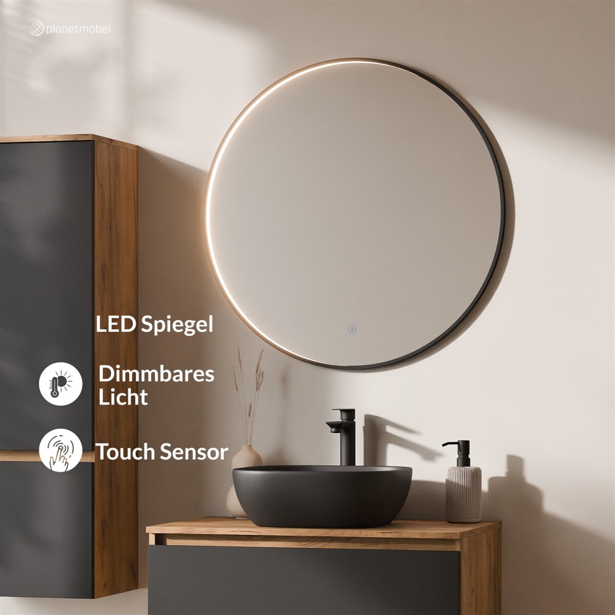 Der runde „Veluna“ LED Spiegel kombiniert modernes Design mit hoher Alltagstauglichkeit. Die dimm- und farbverstellbare LED-Beleuchtung (Warmweiß, Neutralweiß oder Kaltweiß, 4200 K) sorgt für eine gleichmäßige, natürliche Ausleuchtung.