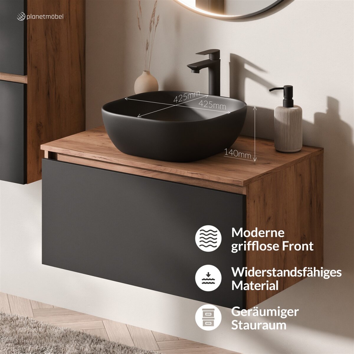 Das im Set enthaltene Keramik-Aufsatzwaschbecken (42,5 x 14 x 42,5 cm) besticht durch seine glatte, kratzfeste Oberfläche und die edle, tiefschwarze Farbgebung. So fügt es sich perfekt in das Design des Waschtischs ein.