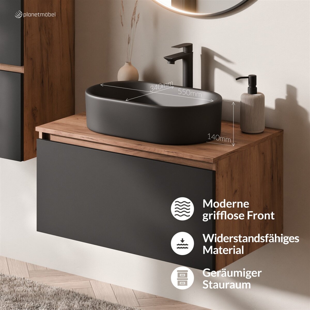 Das im Set enthaltene Keramik-Aufsatzwaschbecken (55 x 14 x 34 cm) besticht durch seine glatte, kratzfeste Oberfläche und die edle, tiefschwarze Farbgebung. So fügt es sich perfekt in das Design des Waschtischs ein.