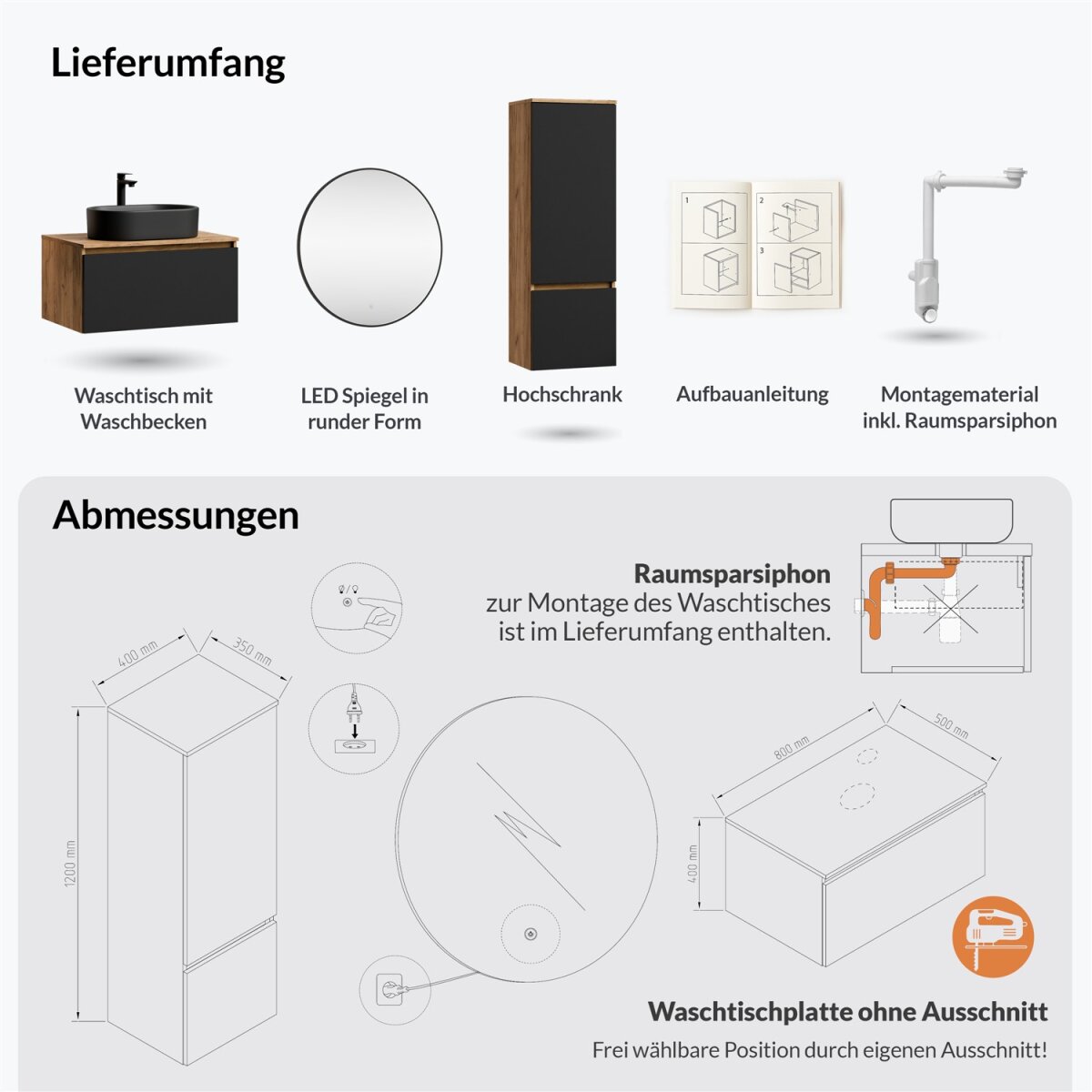 ARISA Badmöbel Set mit Aufsatzwaschbecken & „Veluna“ LED Spiegel – Modernes Design mit Soft-Close-Funktion