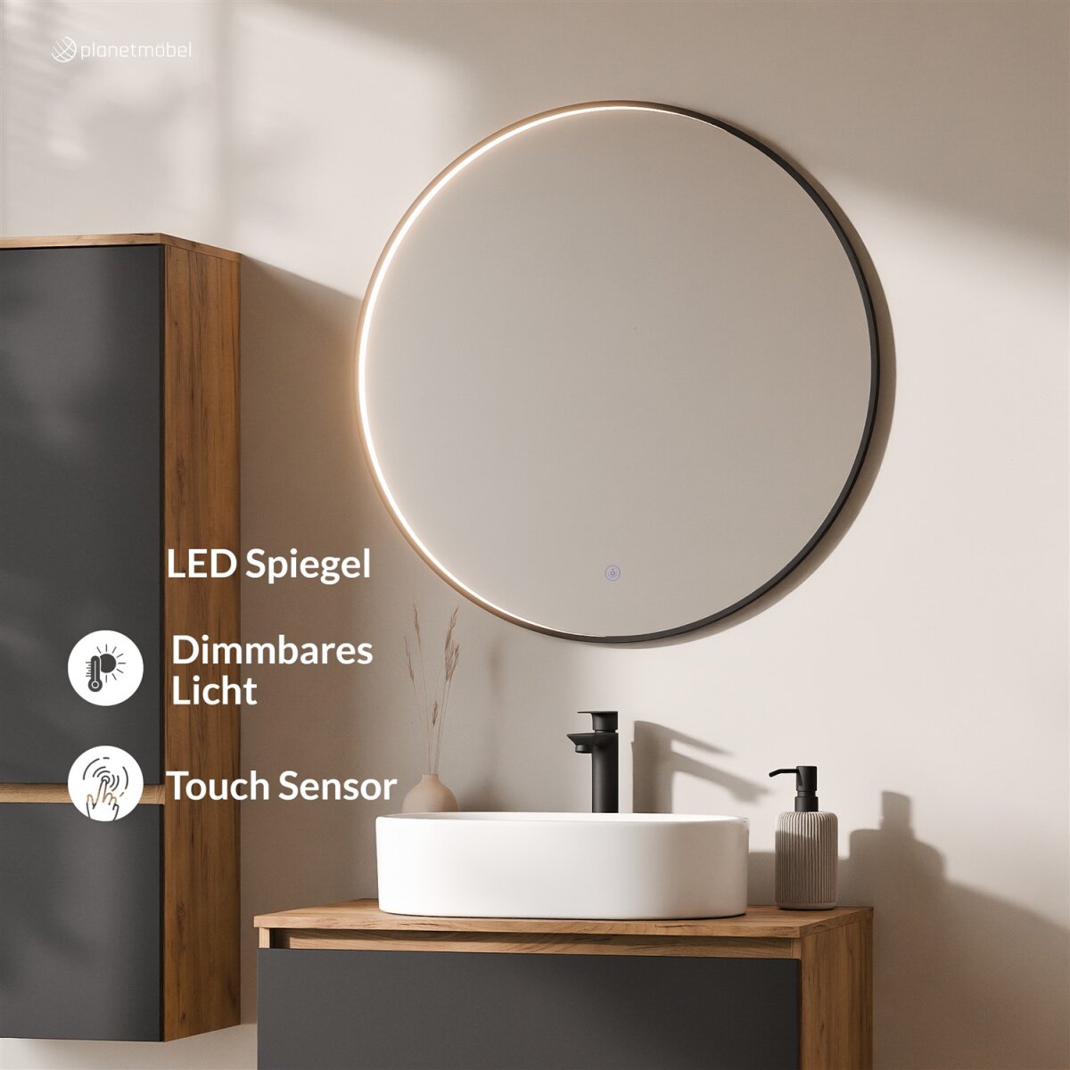 Der runde „Veluna“ LED Spiegel kombiniert modernes Design mit hoher Alltagstauglichkeit. Die dimm- und farbverstellbare LED-Beleuchtung (Warmweiß, Neutralweiß oder Kaltweiß, 4200 K) sorgt für eine gleichmäßige, natürliche Ausleuchtung.