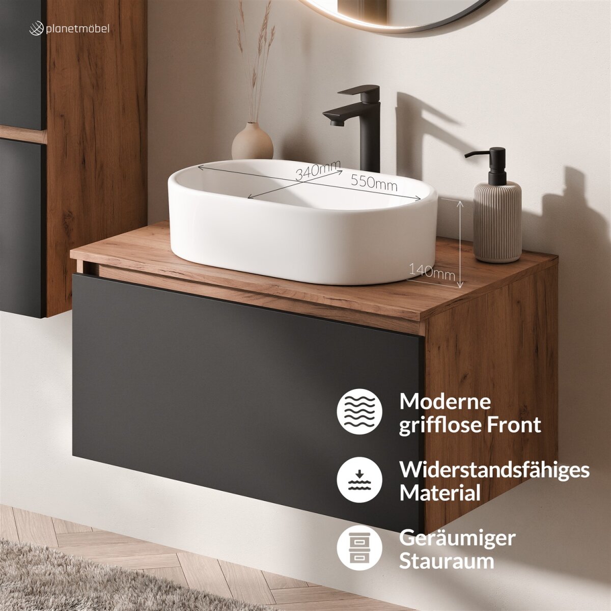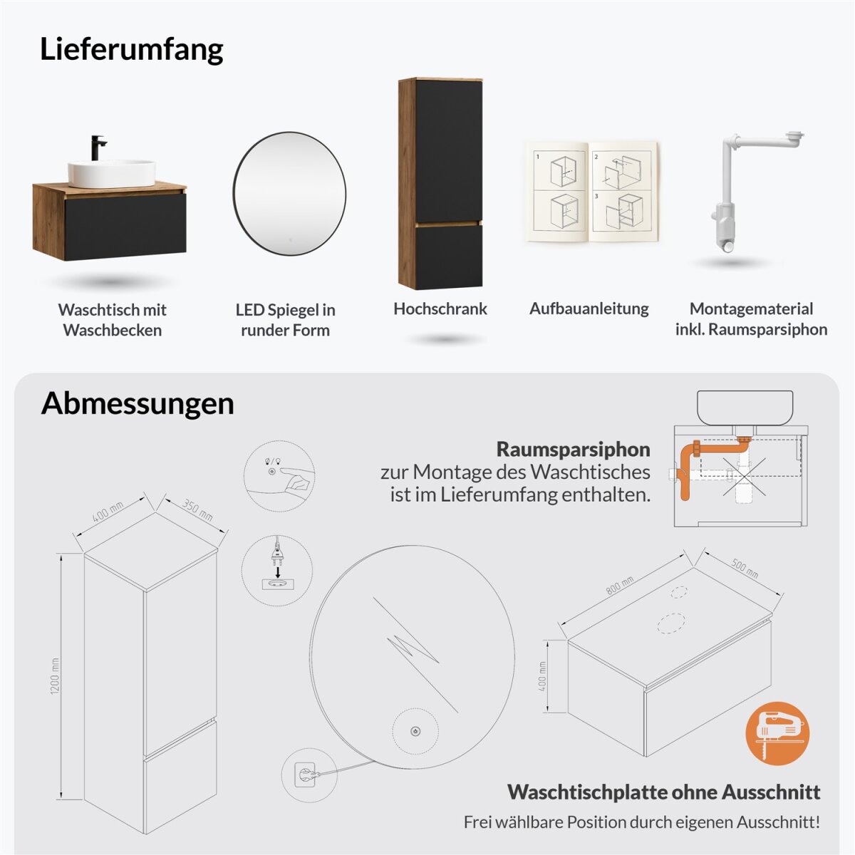 ARISA Badmöbel Set mit Aufsatzwaschbecken & „Veluna“ LED Spiegel – Modernes Design mit Soft-Close-Funktion