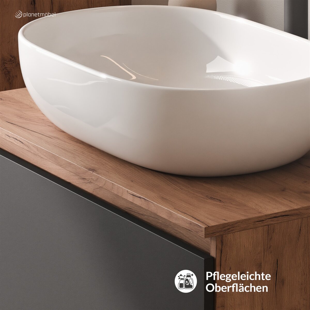 Die Waschtischplatte wird ohne Ausschnitt geliefert, sodass Waschbecken und Armatur flexibel positioniert werden können. Diese Gestaltungsfreiheit ermöglicht eine individuelle Anpassung an Raum, Stil und persönliche Vorlieben.