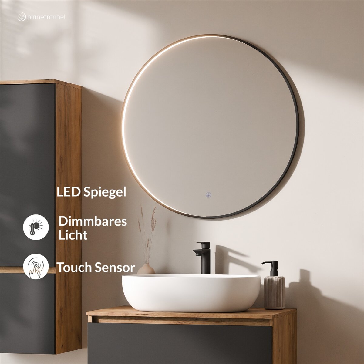 Der runde „Veluna“ LED Spiegel kombiniert modernes Design mit hoher Alltagstauglichkeit. Die dimm- und farbverstellbare LED-Beleuchtung (Warmweiß, Neutralweiß oder Kaltweiß, 4200 K) sorgt für eine gleichmäßige, natürliche Ausleuchtung.