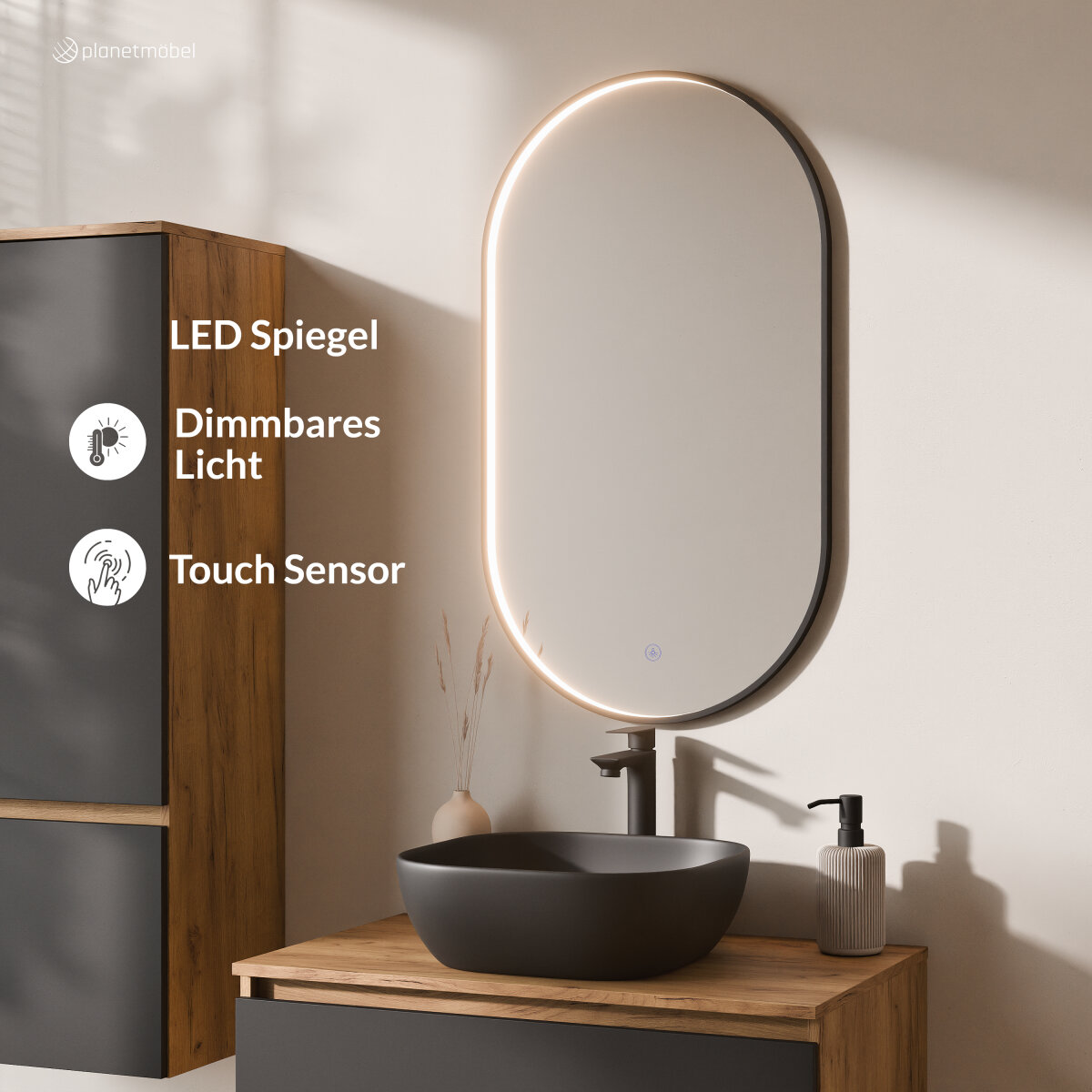 Der Glora LED Spiegel beeindruckt durch sein ovales Design mit elegantem Rahmen und moderner Beleuchtung.