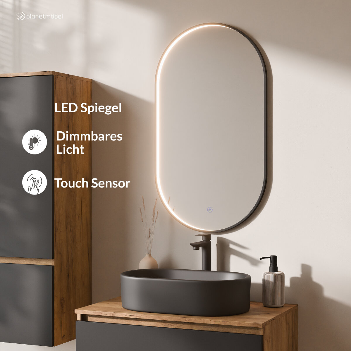 Der Glora LED Spiegel beeindruckt durch sein ovales Design mit elegantem Rahmen und moderner Beleuchtung.