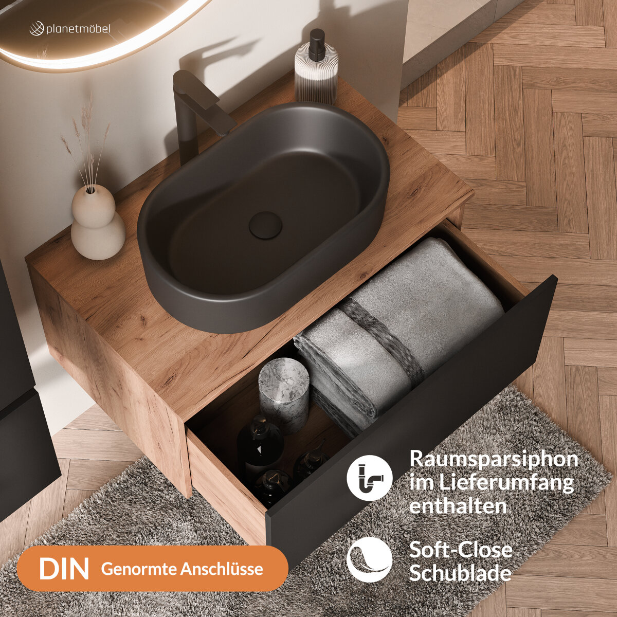 ARISA Badmöbel Set mit Aufsatzwaschbecken & „Glora“ LED Spiegel – Modernes Design mit Soft-Close-Funktion