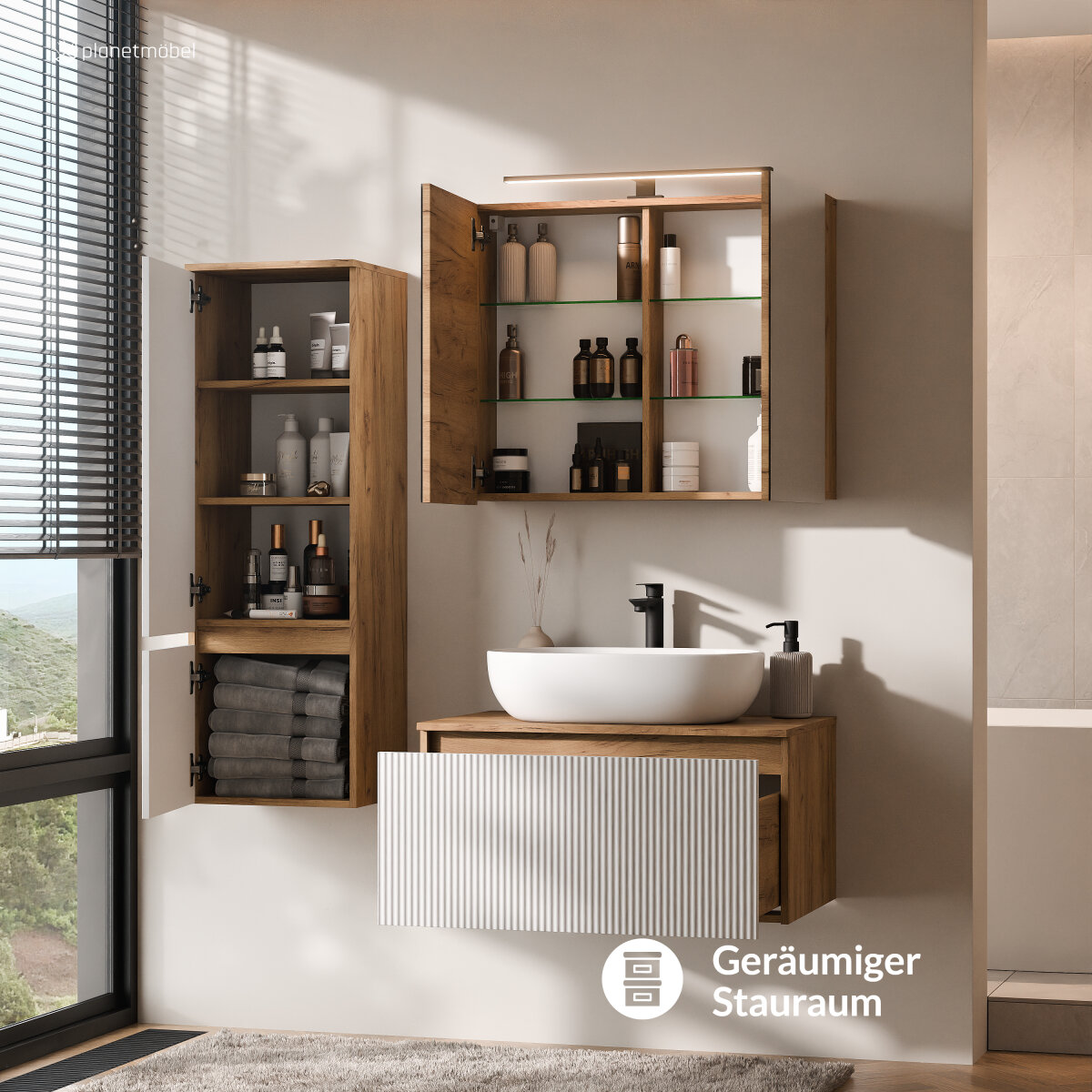 Als ideale Ergänzung zum Waschtischunterschrank bietet der ARISA Hochschrank 120 x 40 x 35 cm zusätzlichen Stauraum für größere Badutensilien oder Handtücher.