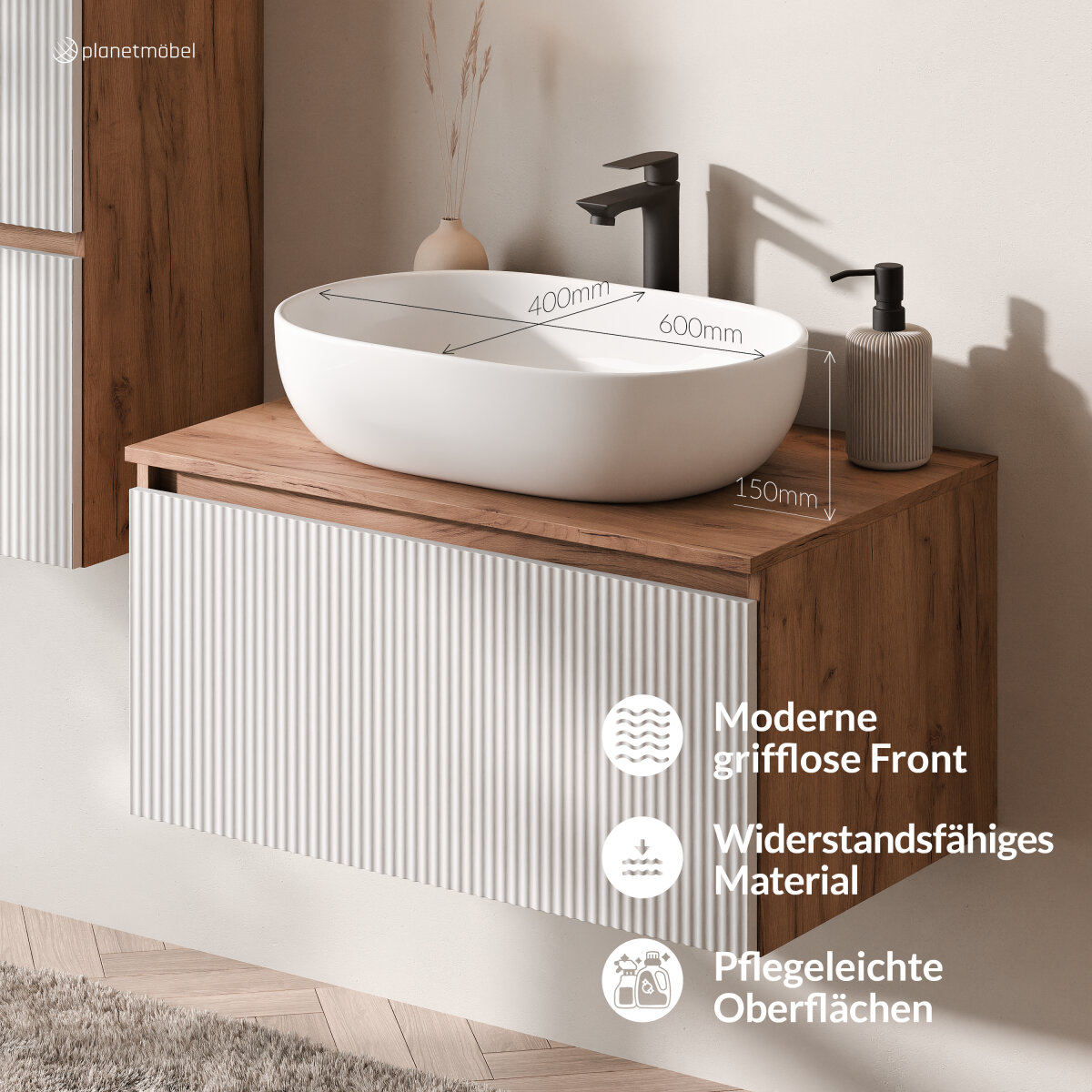 Das im Set enthaltene Keramik-Aufsatzwaschbecken überzeugt mit glatter, kratzfester Oberfläche und moderner Formgebung. Erhältlich in Schwarz oder Weiß sowie in drei Größenvarianten, fügt es sich perfekt in das Design des Waschtischs ein.
