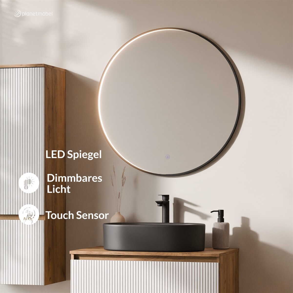 Der runde „Veluna“ LED Spiegel kombiniert modernes Design mit hoher Alltagstauglichkeit. Die dimm- und farbverstellbare LED-Beleuchtung (Warmweiß, Neutralweiß oder Kaltweiß, 4200 K) sorgt für eine gleichmäßige, natürliche Ausleuchtung.