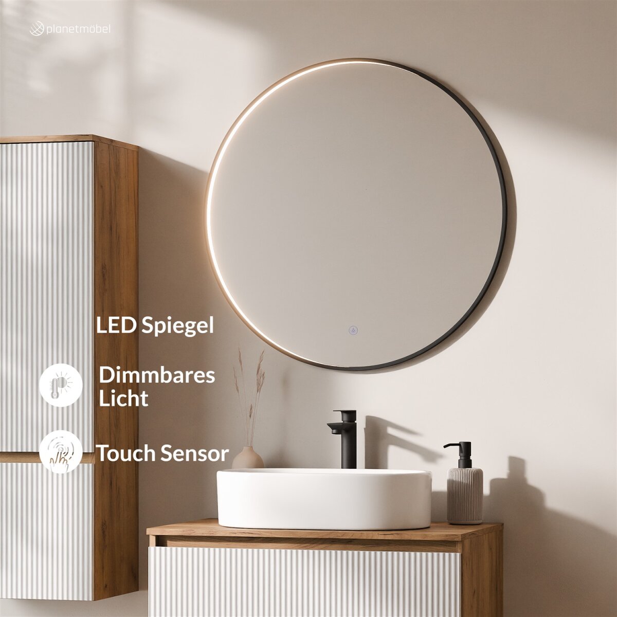 Der runde „Veluna“ LED Spiegel kombiniert modernes Design mit hoher Alltagstauglichkeit. Die dimm- und farbverstellbare LED-Beleuchtung (Warmweiß, Neutralweiß oder Kaltweiß, 4200 K) sorgt für eine gleichmäßige, natürliche Ausleuchtung.