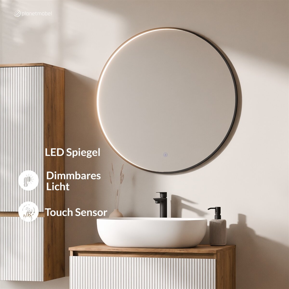 Der runde „Veluna“ LED Spiegel kombiniert modernes Design mit hoher Alltagstauglichkeit. Die dimm- und farbverstellbare LED-Beleuchtung (Warmweiß, Neutralweiß oder Kaltweiß, 4200 K) sorgt für eine gleichmäßige, natürliche Ausleuchtung.