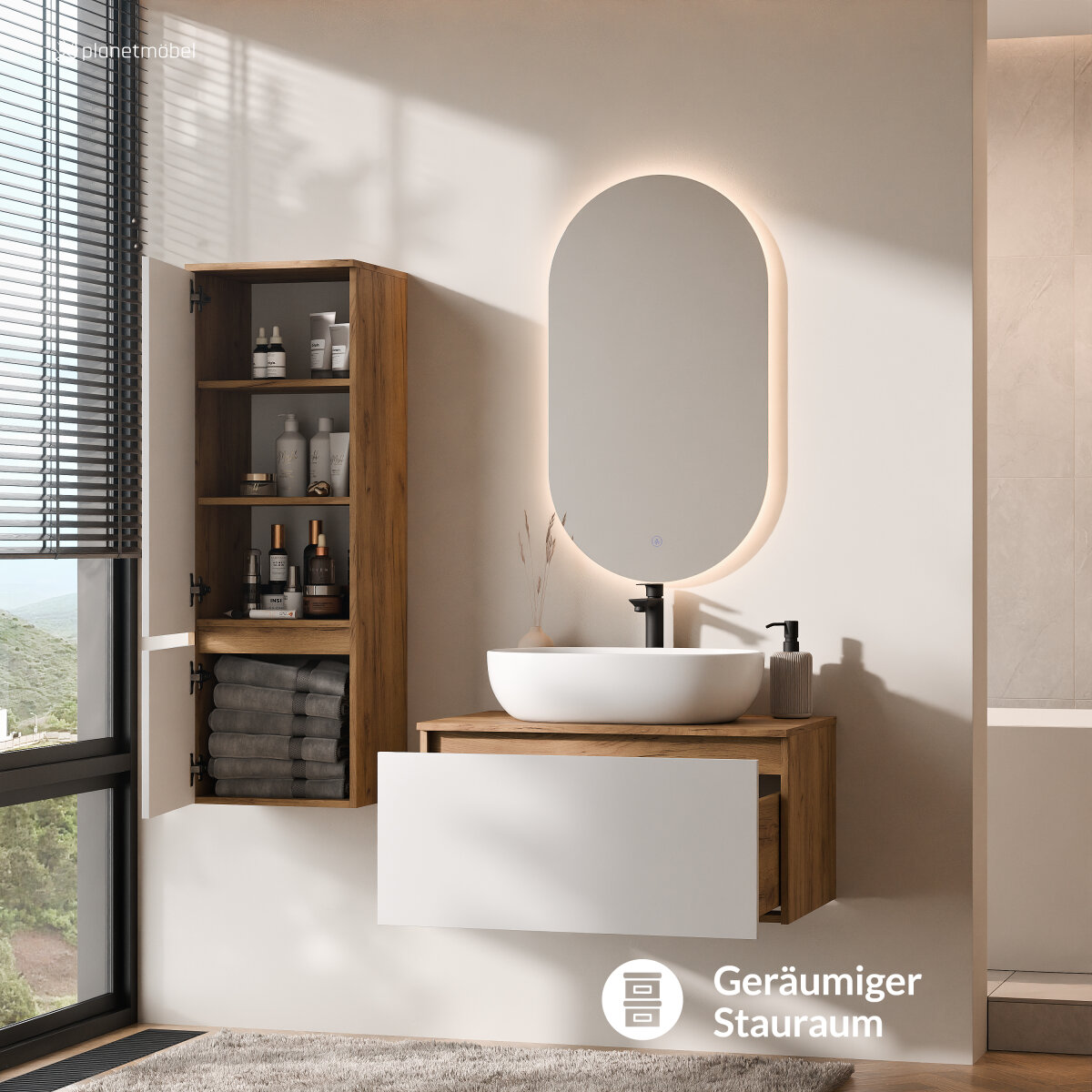 Der Waschtischunterschrank bietet großzügigen Platz für Handtücher, Pflegeprodukte und Badutensilien. Dank der Soft-Close-Funktion schließen die Schubladen sanft und leise – das schont das Material und sorgt für ein angenehmes Nutzungserlebnis.