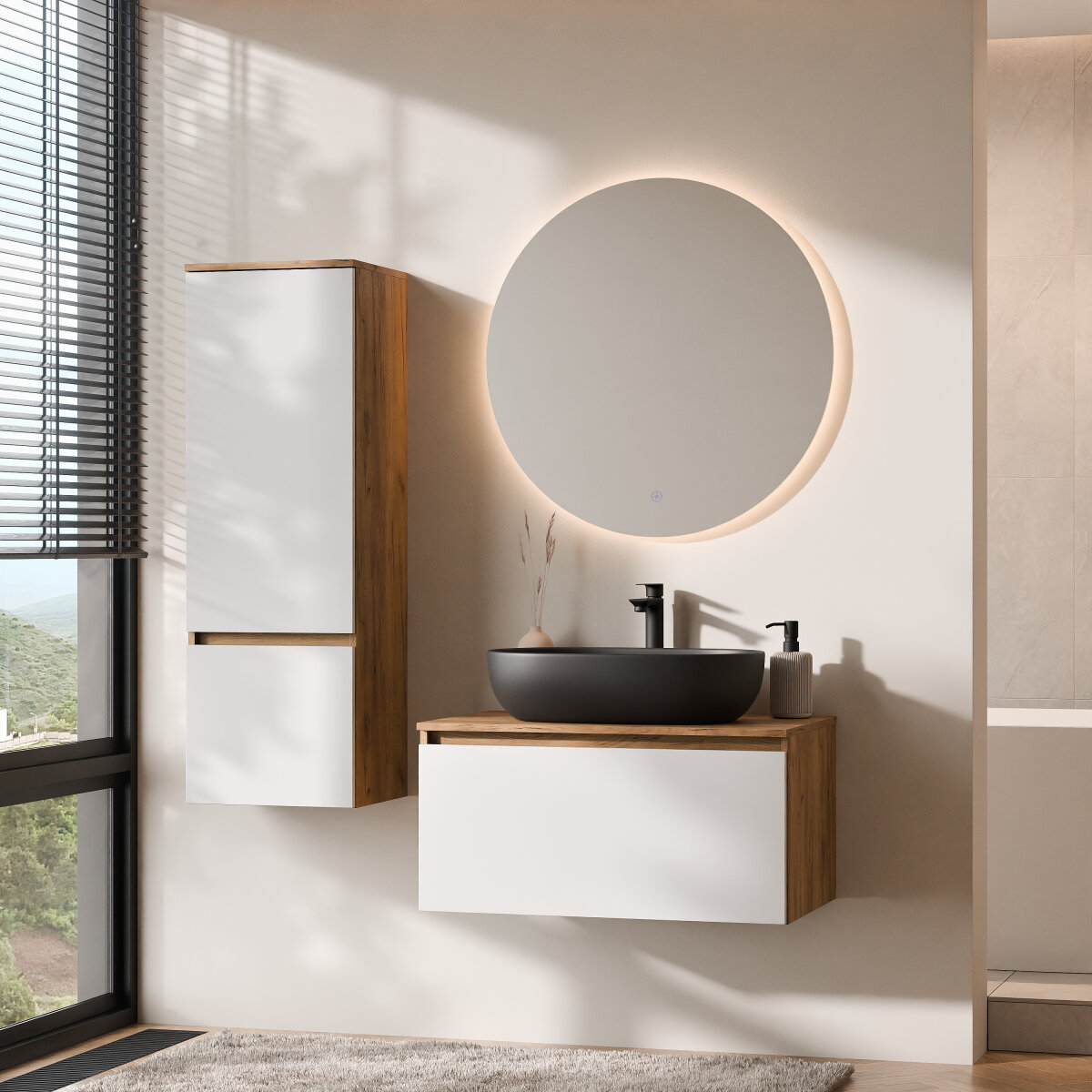 ARISA Badmöbel Set mit Aufsatzwaschbecken & „Nova“ LED Spiegel – Modernes Design mit Soft-Close-Funktion