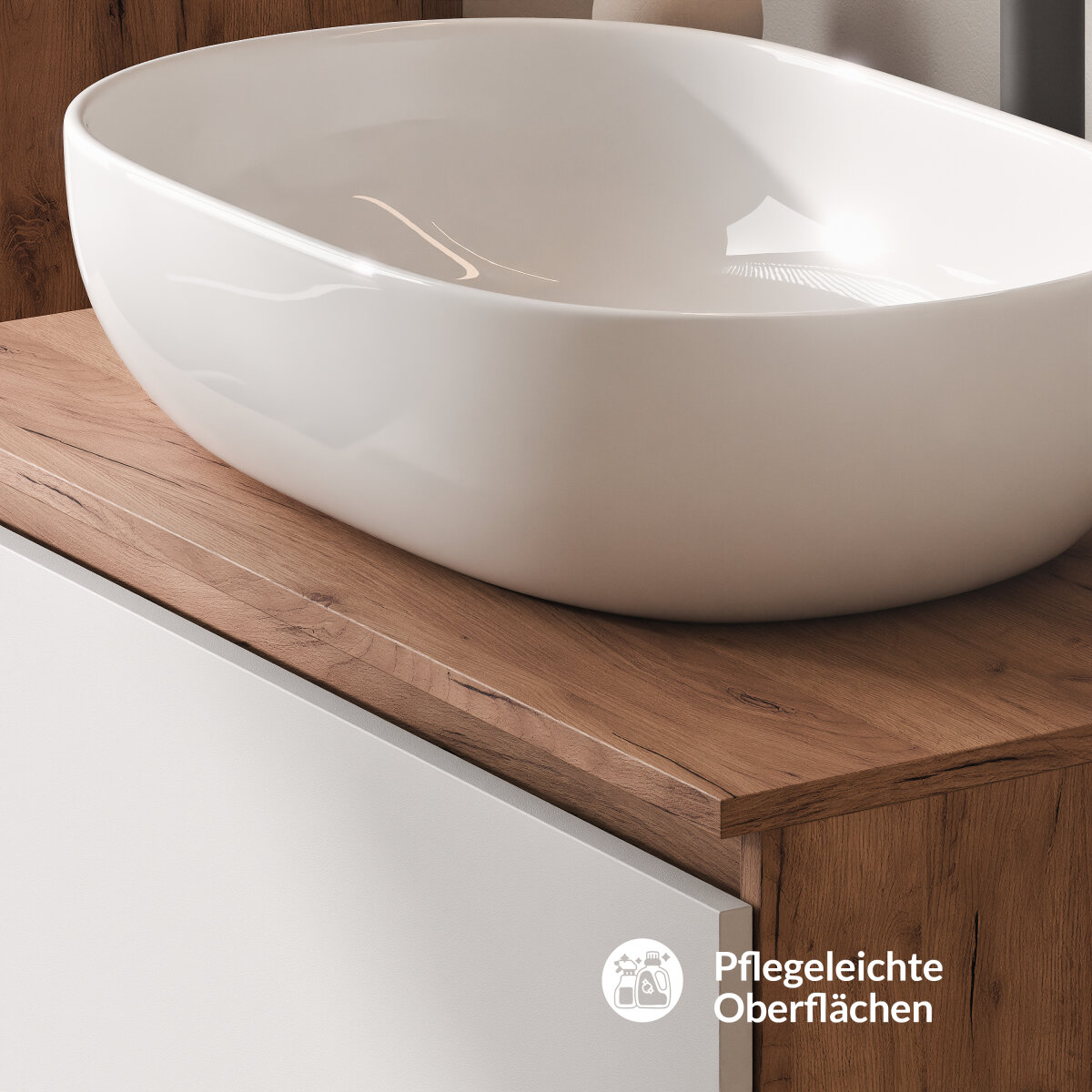 Das im Set enthaltene Keramik-Aufsatzwaschbecken (60 x 40 x 15 cm) besticht durch seine glatte, kratzfeste Oberfläche und die edle, weiße Farbgebung. So fügt es sich perfekt in das Design des Waschtischs ein.