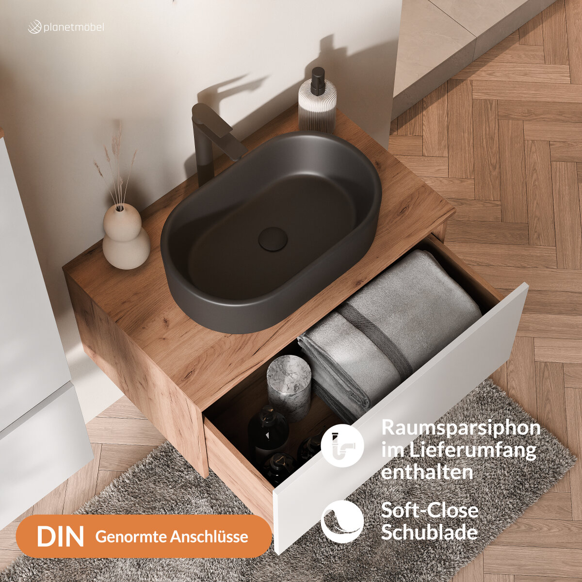 Der Waschtischunterschrank bietet großzügigen Platz für Handtücher, Pflegeprodukte und Badutensilien. Dank der Soft-Close-Funktion schließen die Schubladen sanft und leise – das schont das Material und sorgt für ein angenehmes Nutzungserlebnis.