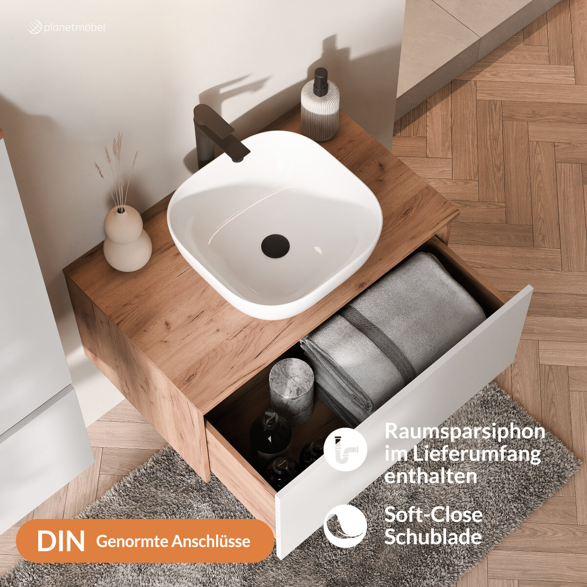Das im Set enthaltene Keramik-Aufsatzwaschbecken überzeugt mit glatter, kratzfester Oberfläche und moderner Formgebung. Erhältlich in Schwarz oder Weiß sowie in drei Größenvarianten, fügt es sich perfekt in das Design des Waschtischs ein.