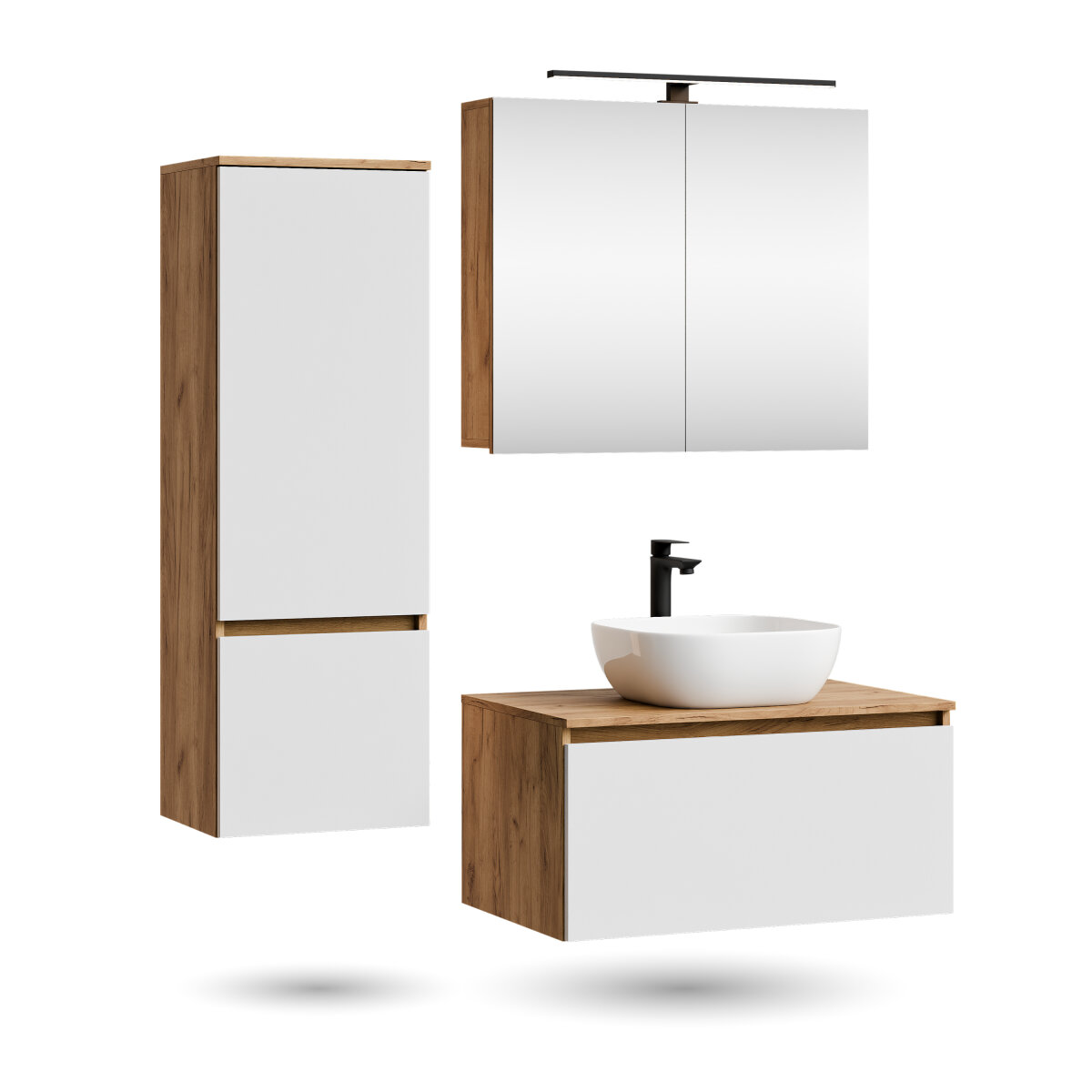 ARISA Badmöbel Set inkl. Hochschrank mit Aufsatzwaschbecken & Spiegelschrank ARIA – Modernes Design mit Soft-Close-Funktion