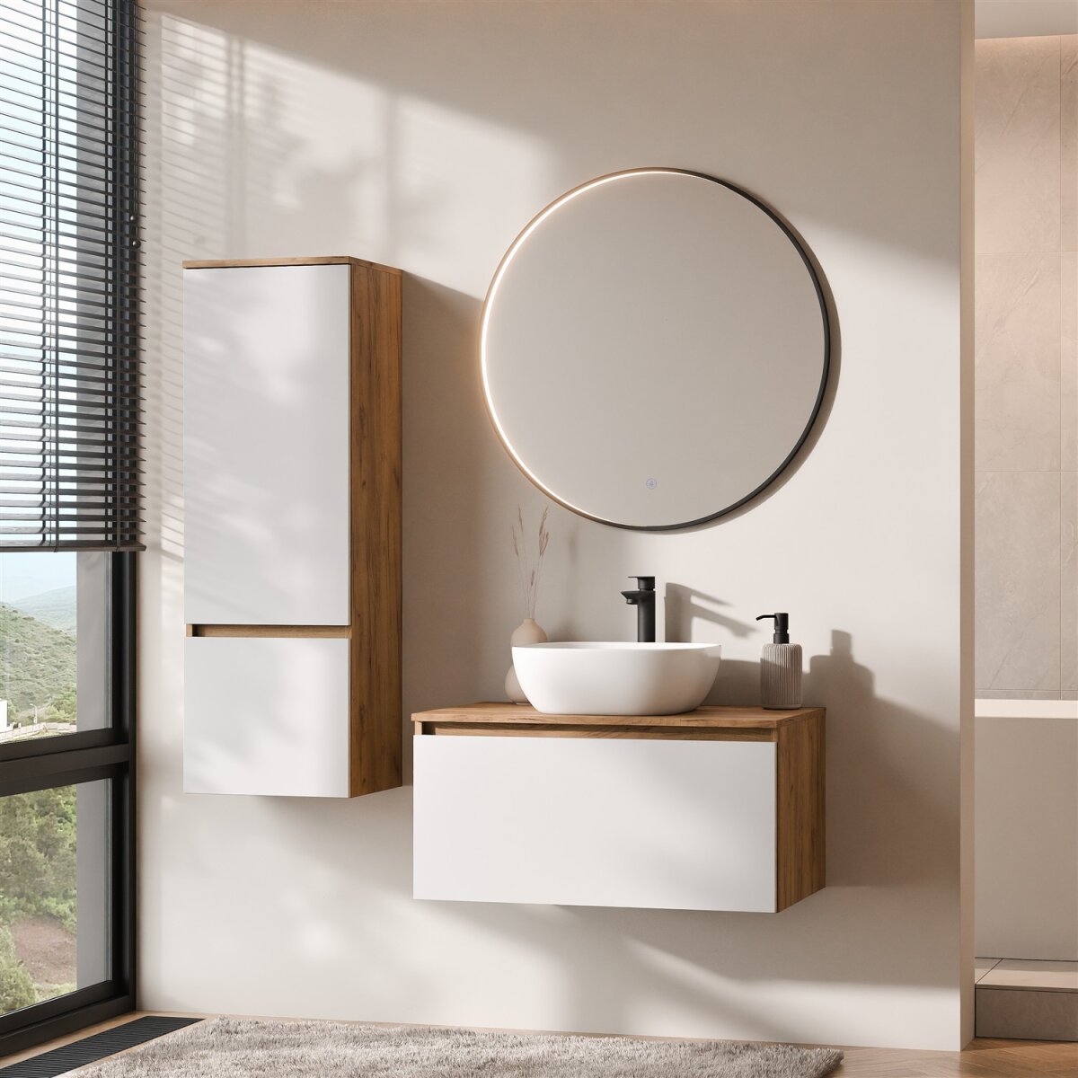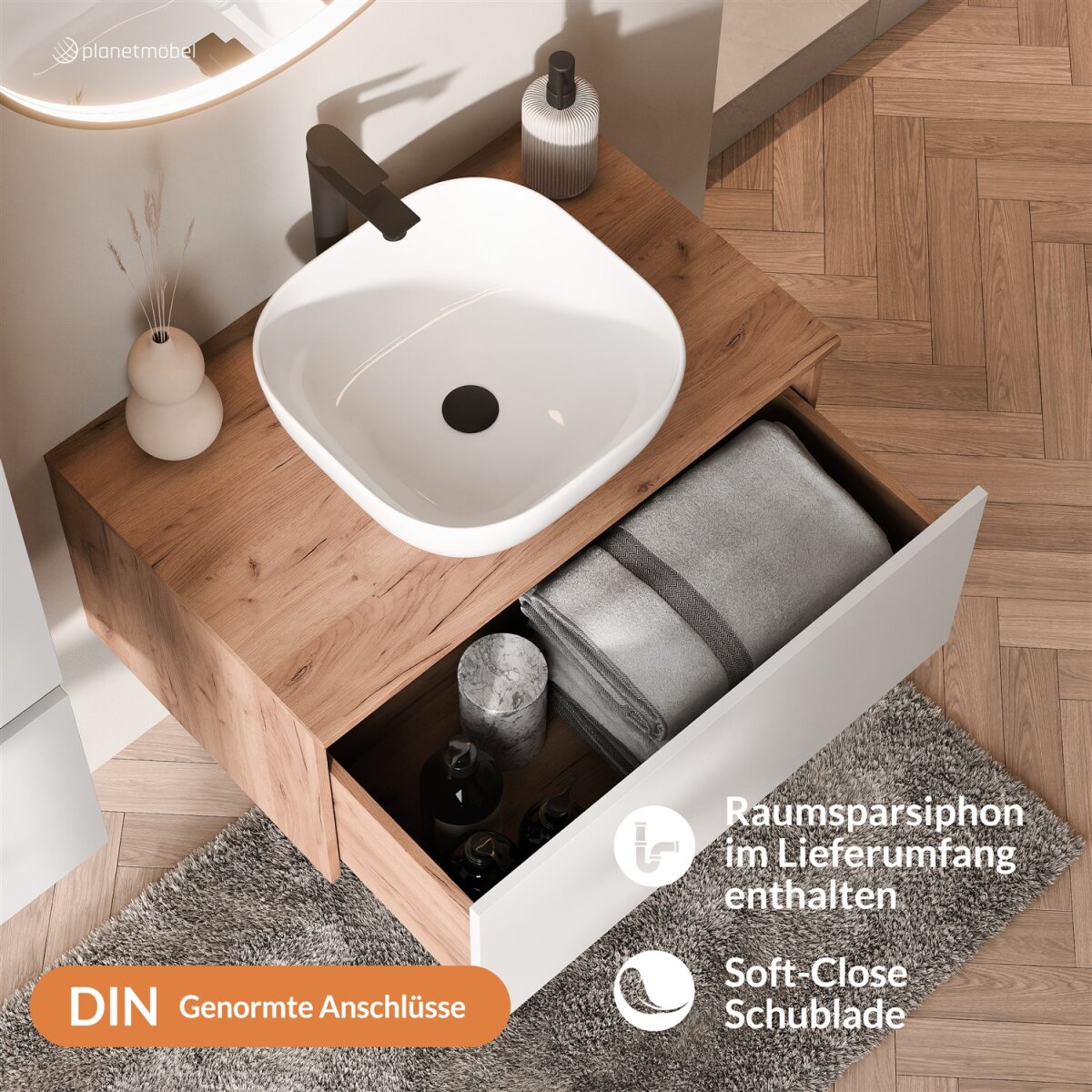ARISA Badmöbel Set mit Aufsatzwaschbecken & „Veluna“ LED Spiegel – Modernes Design mit Soft-Close-Funktion