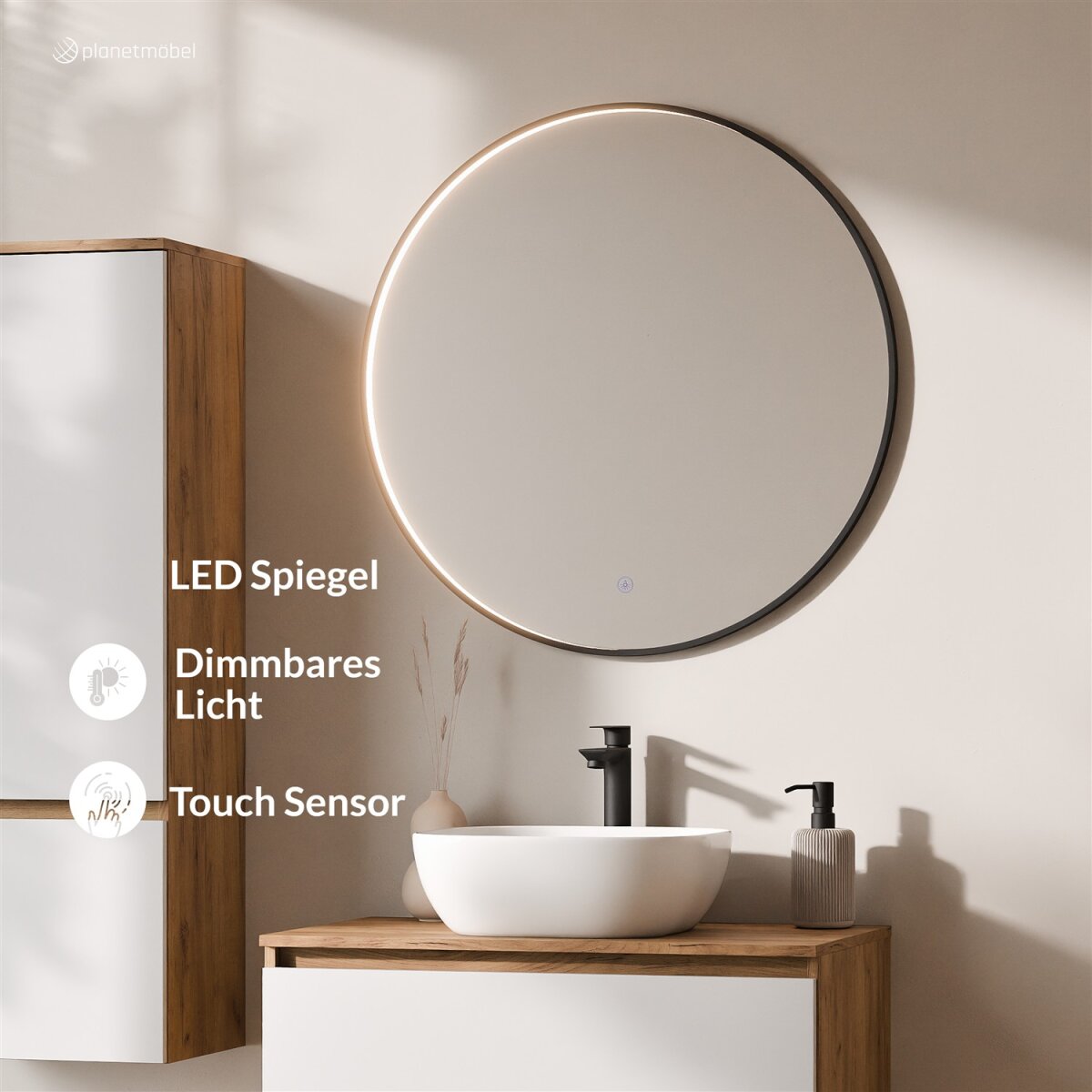 Der runde „Veluna“ LED Spiegel kombiniert modernes Design mit hoher Alltagstauglichkeit. Die dimm- und farbverstellbare LED-Beleuchtung (Warmweiß, Neutralweiß oder Kaltweiß, 4200 K) sorgt für eine gleichmäßige, natürliche Ausleuchtung.