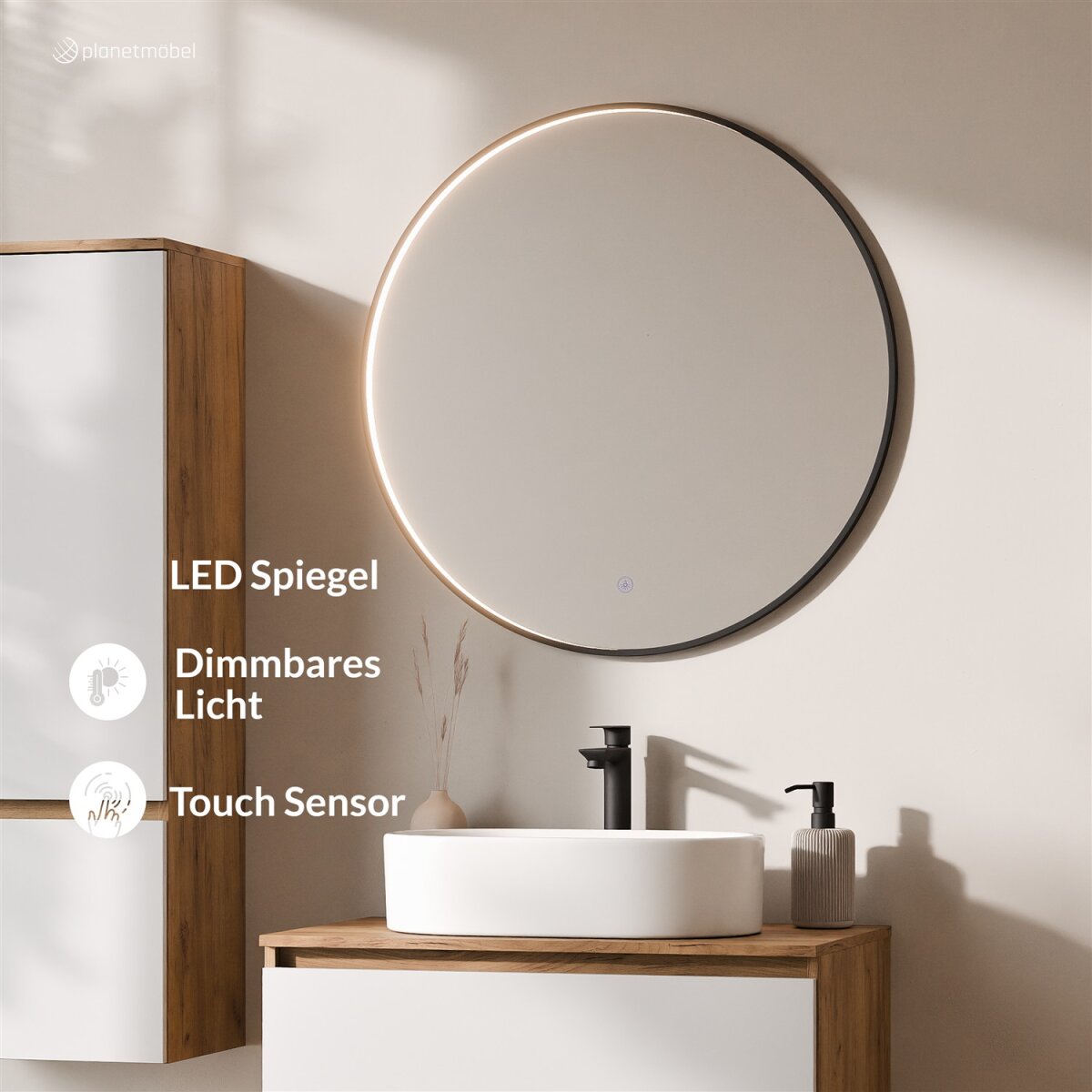 Der runde „Veluna“ LED Spiegel kombiniert modernes Design mit hoher Alltagstauglichkeit. Die dimm- und farbverstellbare LED-Beleuchtung (Warmweiß, Neutralweiß oder Kaltweiß, 4200 K) sorgt für eine gleichmäßige, natürliche Ausleuchtung.