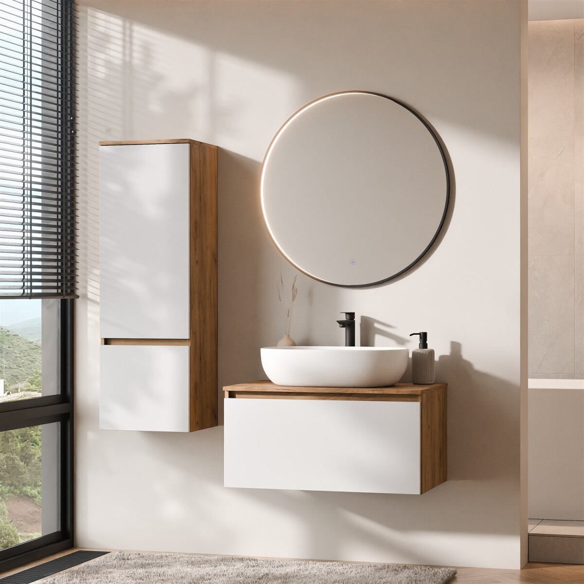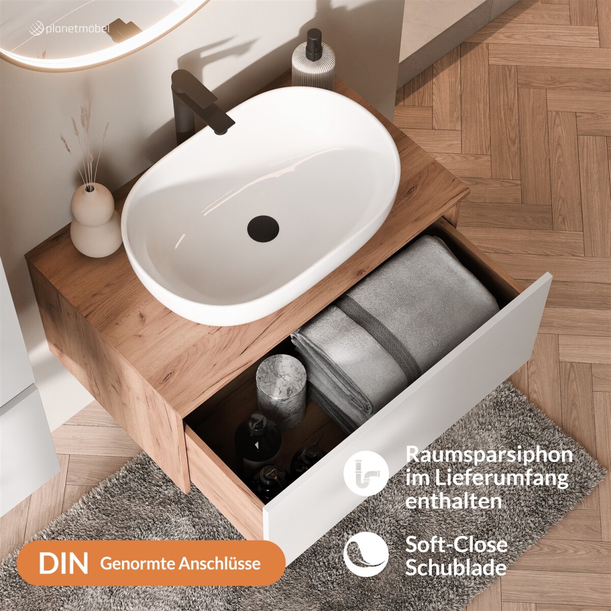 ARISA Badmöbel Set mit Aufsatzwaschbecken & „Veluna“ LED Spiegel – Modernes Design mit Soft-Close-Funktion