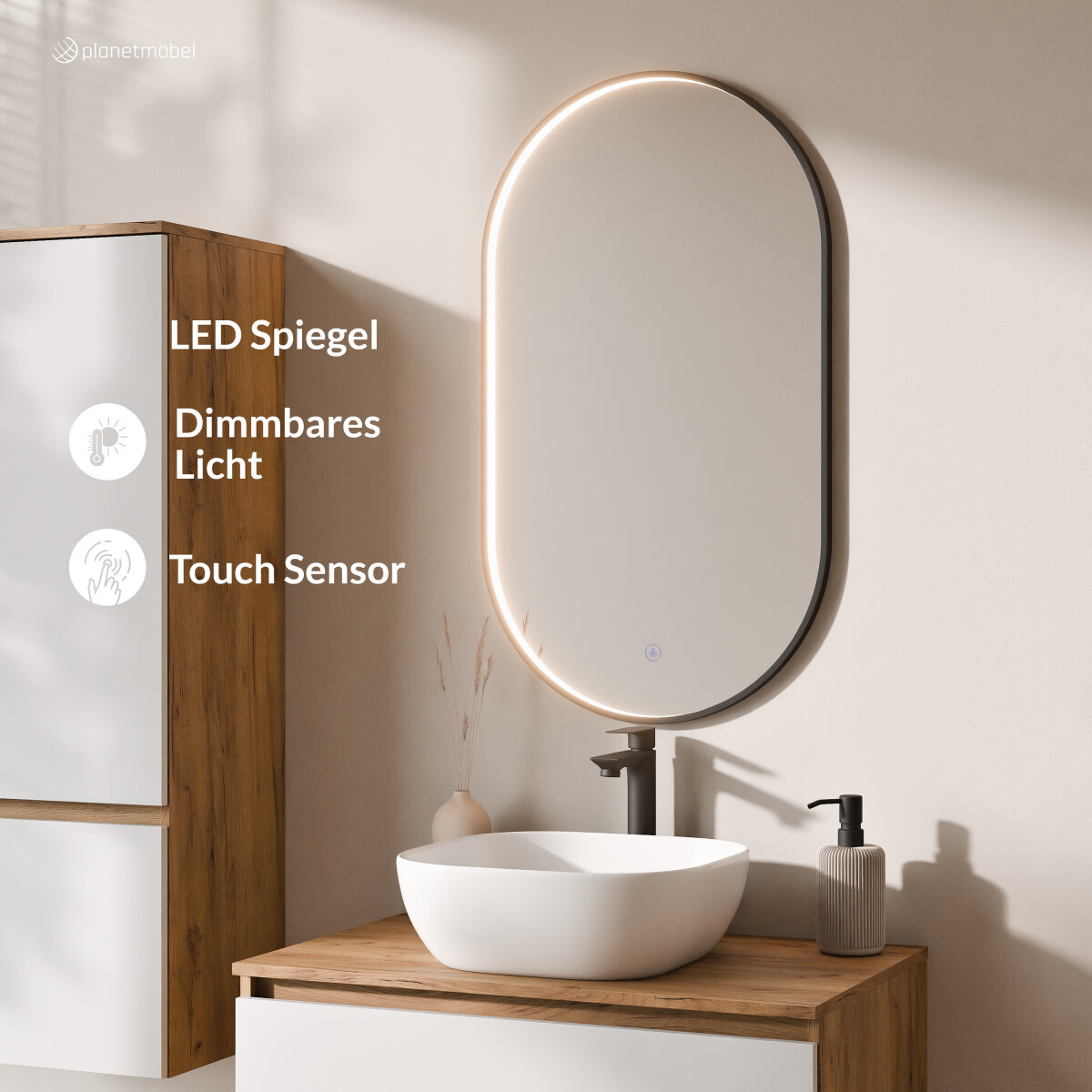 Der Glora LED Spiegel beeindruckt durch sein ovales Design mit elegantem Rahmen und moderner Beleuchtung.