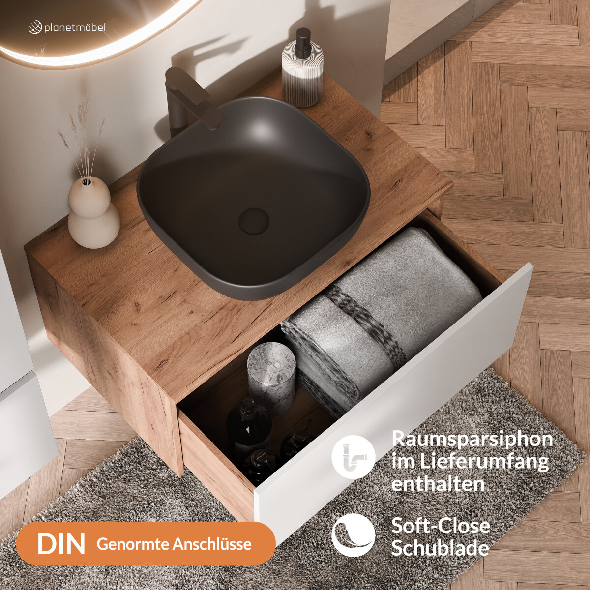 ARISA Badmöbel Set mit Aufsatzwaschbecken & „Glora“ LED Spiegel – Modernes Design mit Soft-Close-Funktion