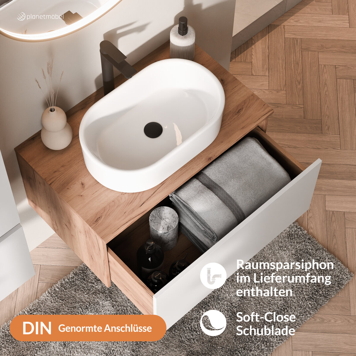 ARISA Badmöbel Set mit Aufsatzwaschbecken & „Glora“ LED Spiegel – Modernes Design mit Soft-Close-Funktion