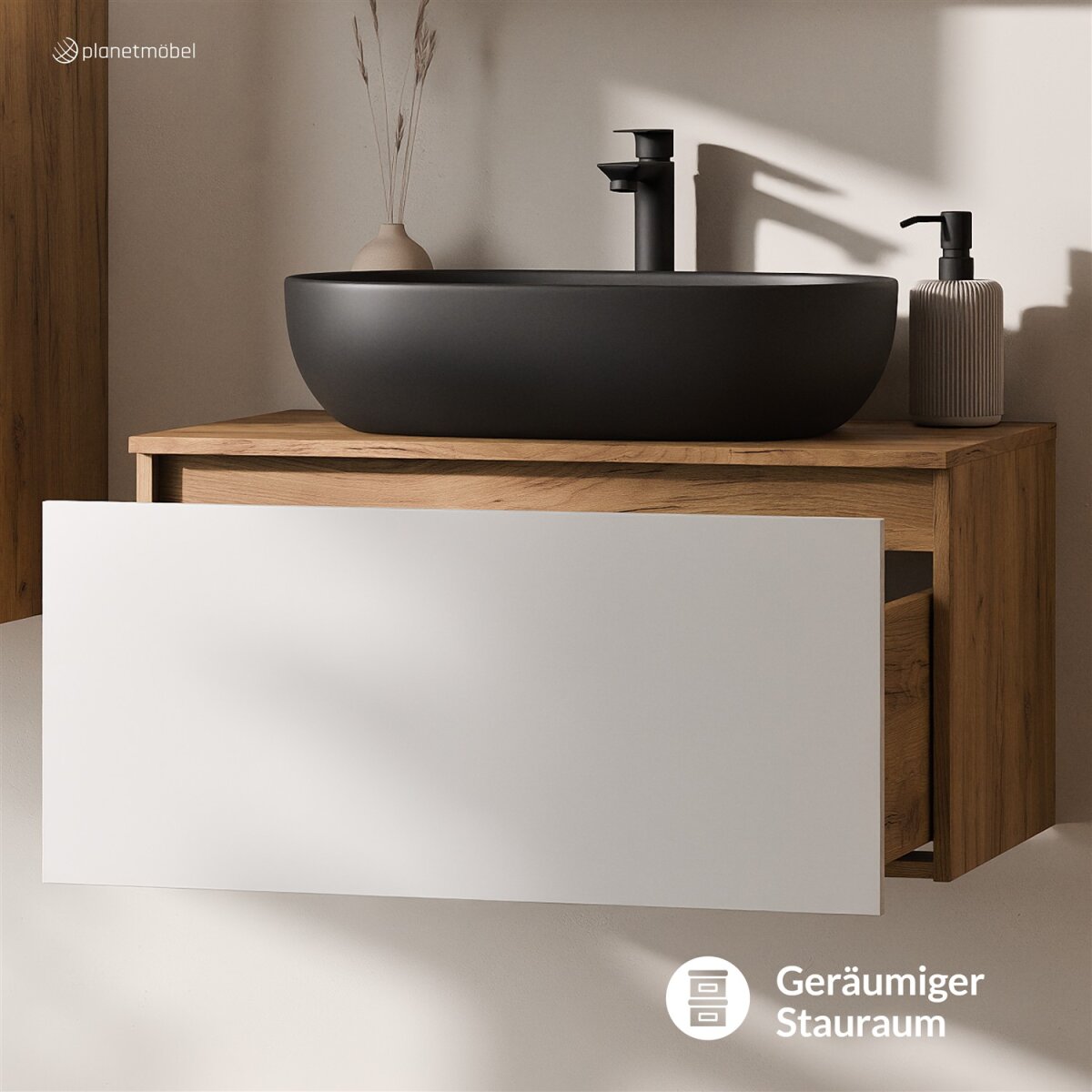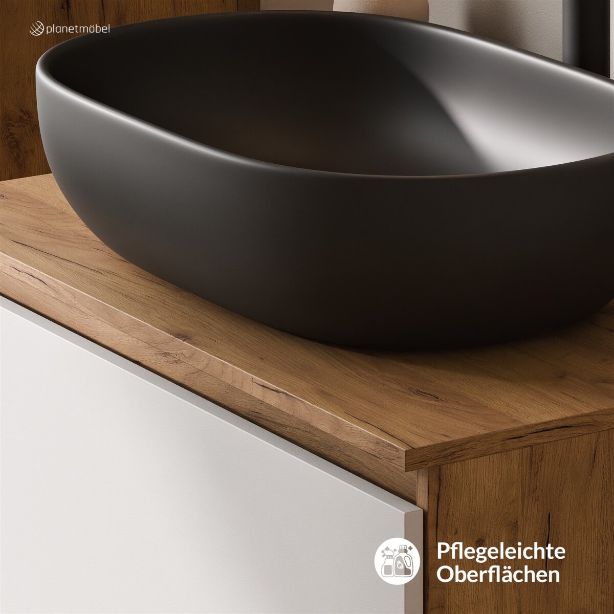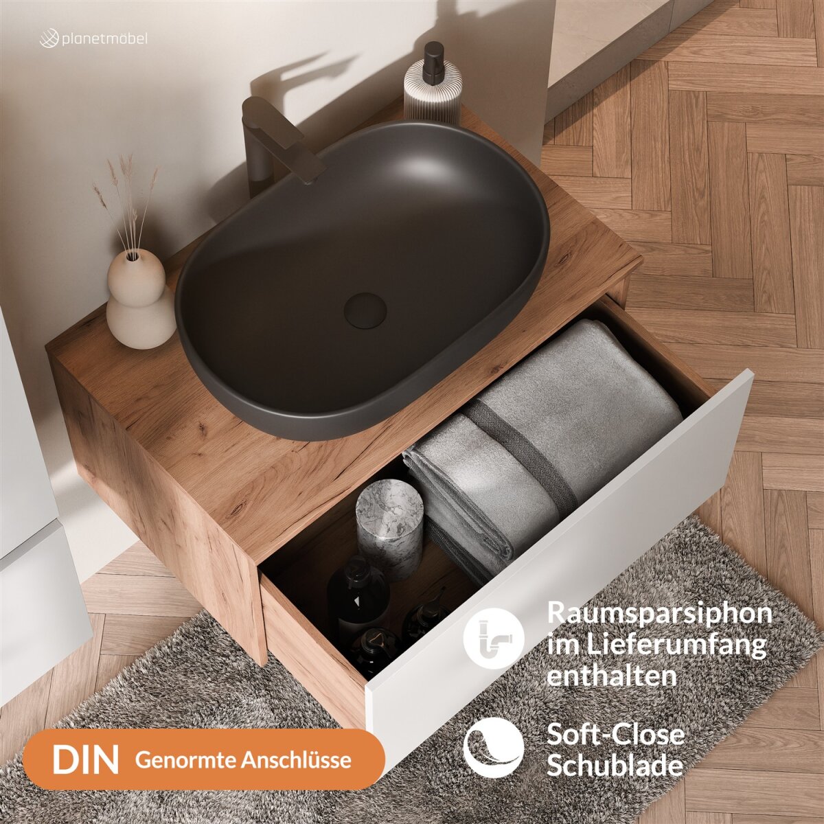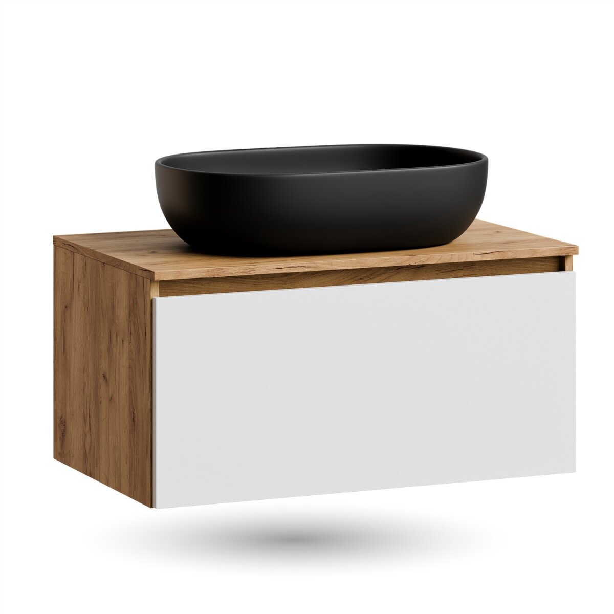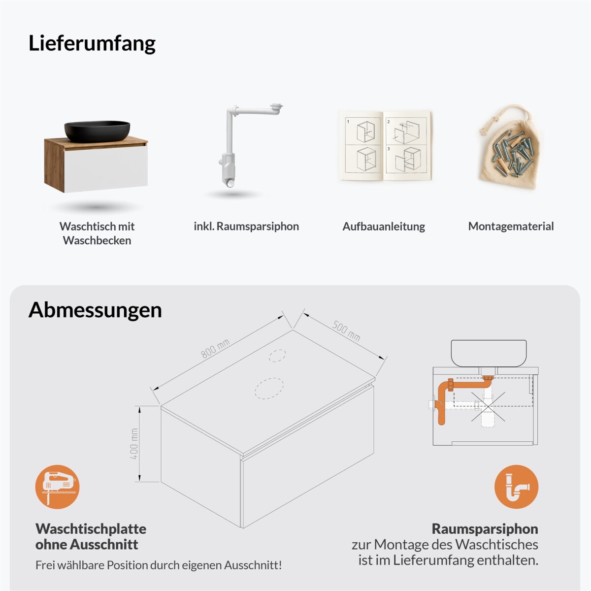 ARISA Waschtisch 80 cm Weiß mit Keramik-Aufsatzwaschbecken 60 cm in Schwarz – Moderner Badunterschrank mit Soft Close Funktion