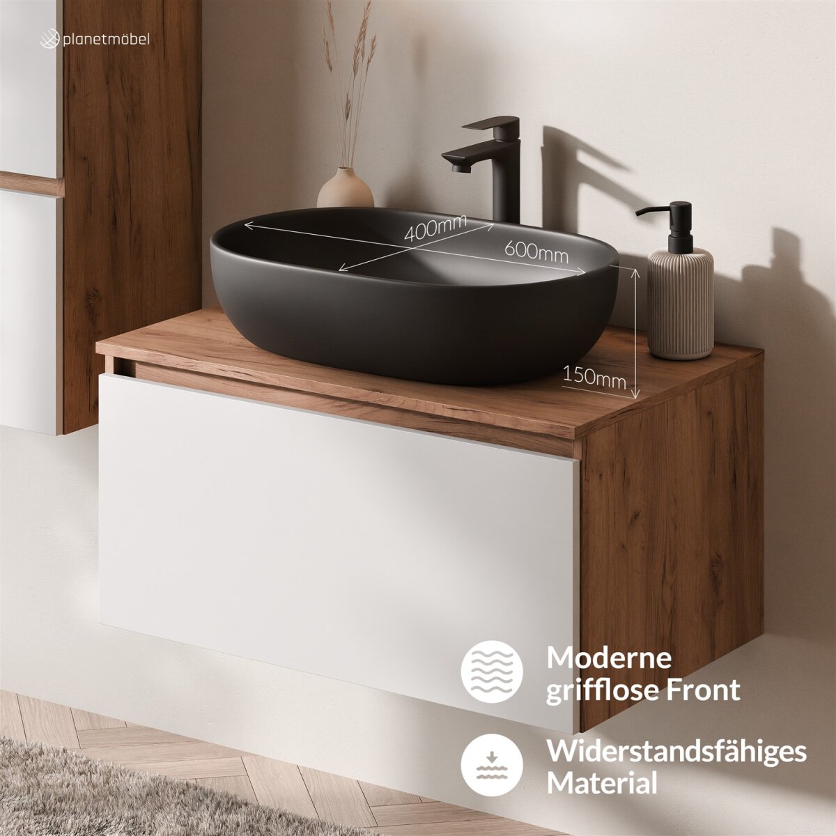 Das Keramik-Aufsatzwaschbecken (60 x 40 x 15 cm) besticht durch seine glatte, kratzfeste Oberfläche und die edle, tiefschwarze Farbgebung. Es fügt sich harmonisch in das Gesamtbild des Waschtischs ein und unterstreicht den modernen Charakter. Die genormten Anschlüsse ermöglichen die freie Wahl einer passenden Ablaufgarnitur und Armatur.