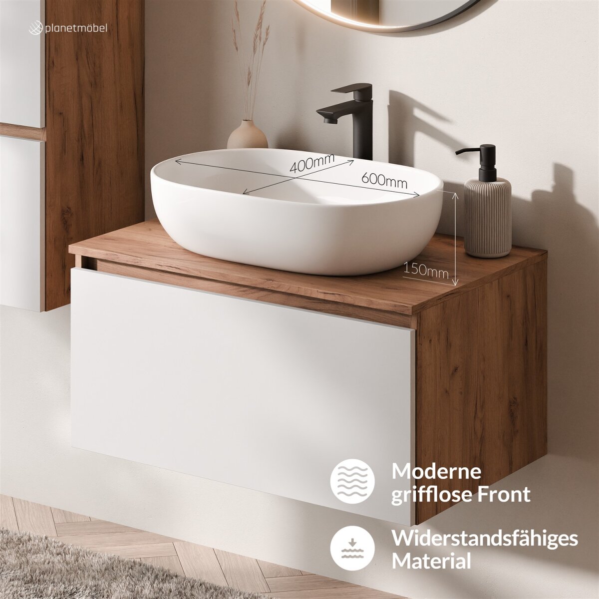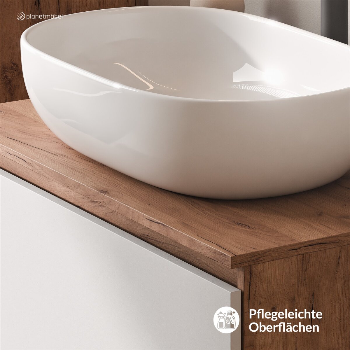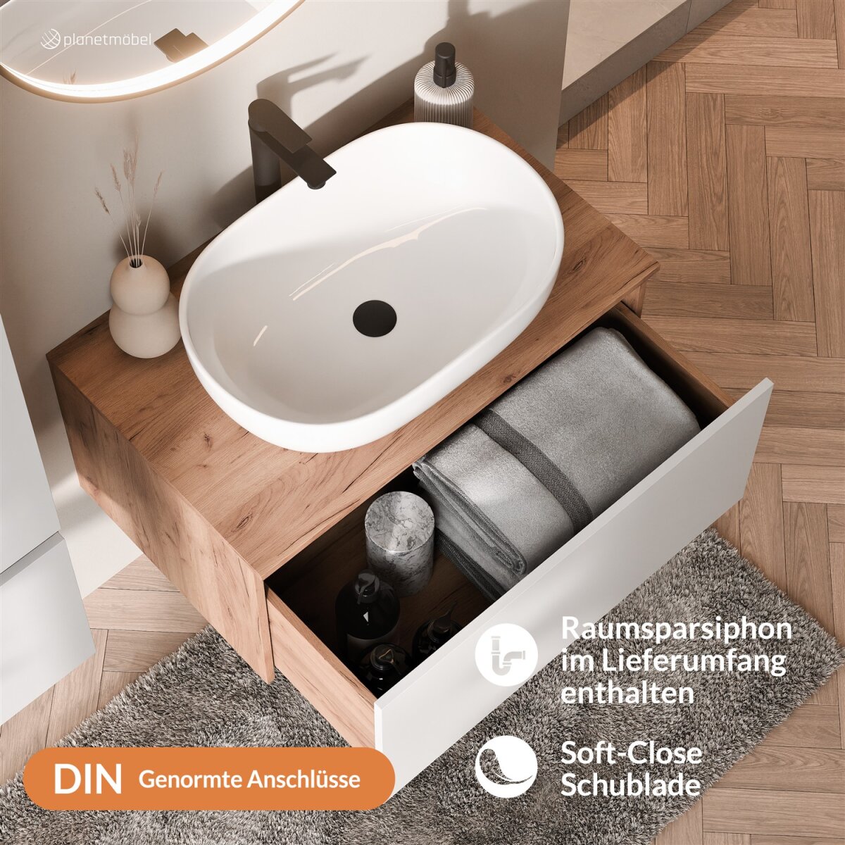 ARISA Waschtisch 80 cm Weiß mit Keramik-Aufsatzwaschbecken 60 cm in Weiß – Moderner Badunterschrank mit Soft Close Funktion