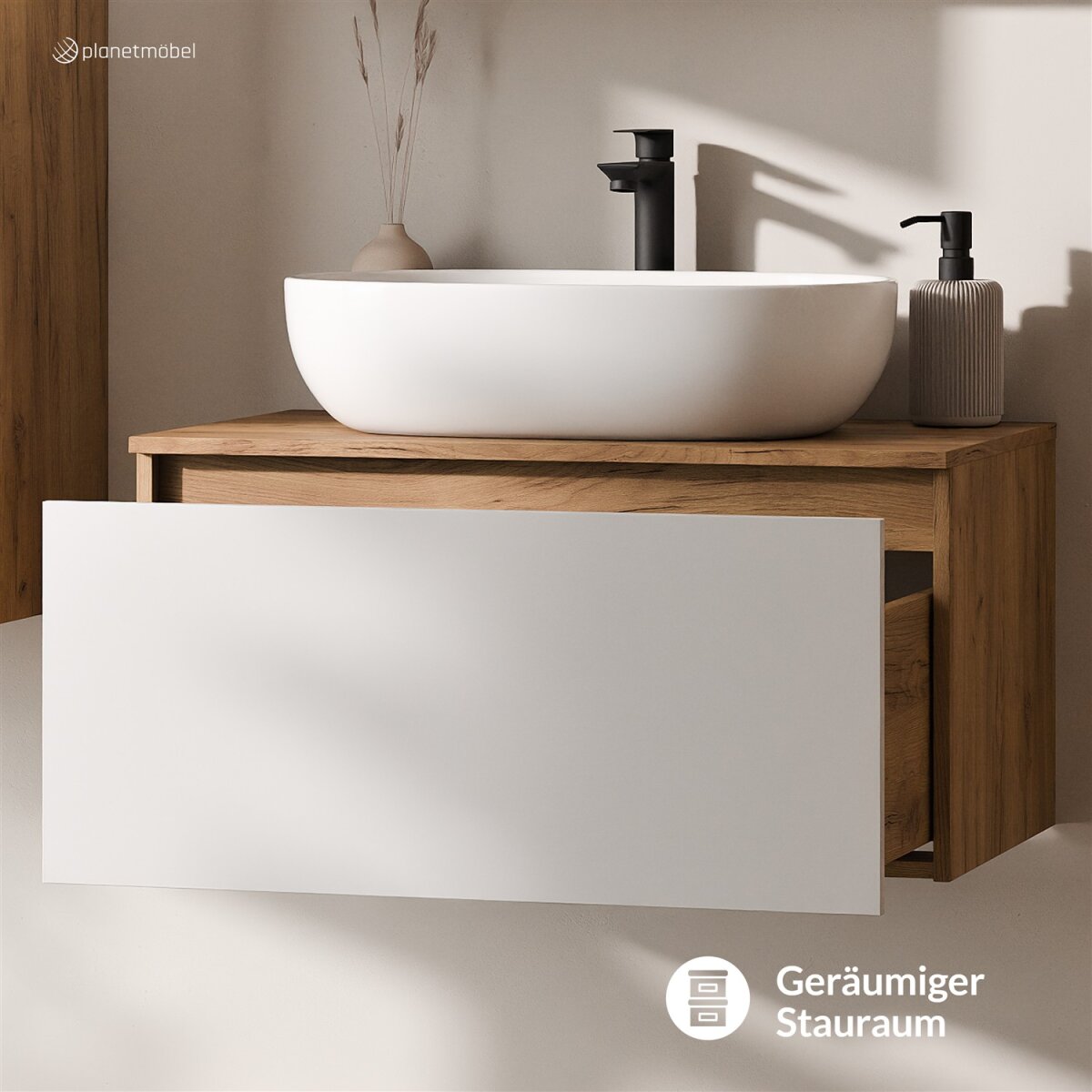 Die Waschtischplatte wird ohne Ausschnitt geliefert, sodass Sie Waschbecken und Armatur frei positionieren können. Diese Gestaltungsfreiheit erlaubt eine individuelle Anpassung an Raum, Stil und persönliche Vorlieben. Die breite Ablagefläche bietet zusätzlich Platz für Seifenspender, Pflegeprodukte oder dekorative Accessoires.