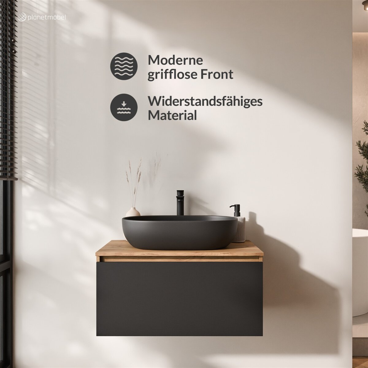 Der ARISA Waschtisch 80 cm vereint exklusives Design mit durchdachter Funktionalität. Die elegante Front, erhältlich in mattem Schwarz, verleiht dem Badezimmer eine moderne und luxuriöse Ausstrahlung. So entsteht ein stilvoller Blickfang für alle, die Wert auf Ästhetik, Qualität und Langlebigkeit legen.