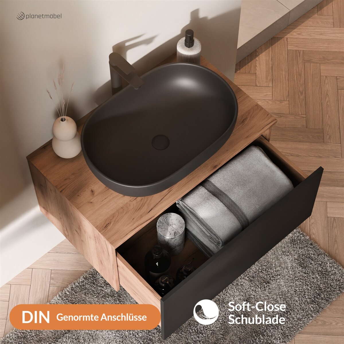 Kombinierbar mit eleganten Keramik-Aufsatzwaschbecken in Schwarz oder Weiß